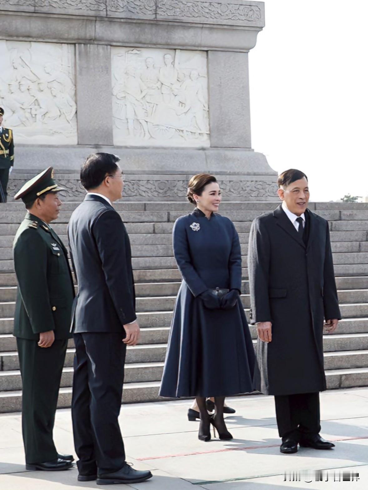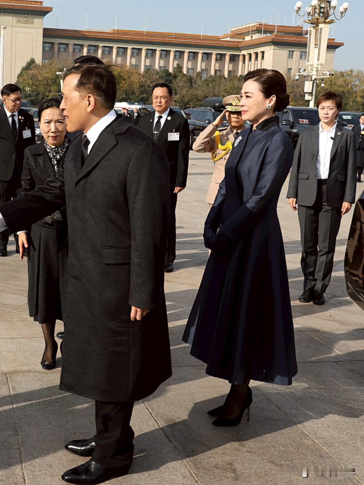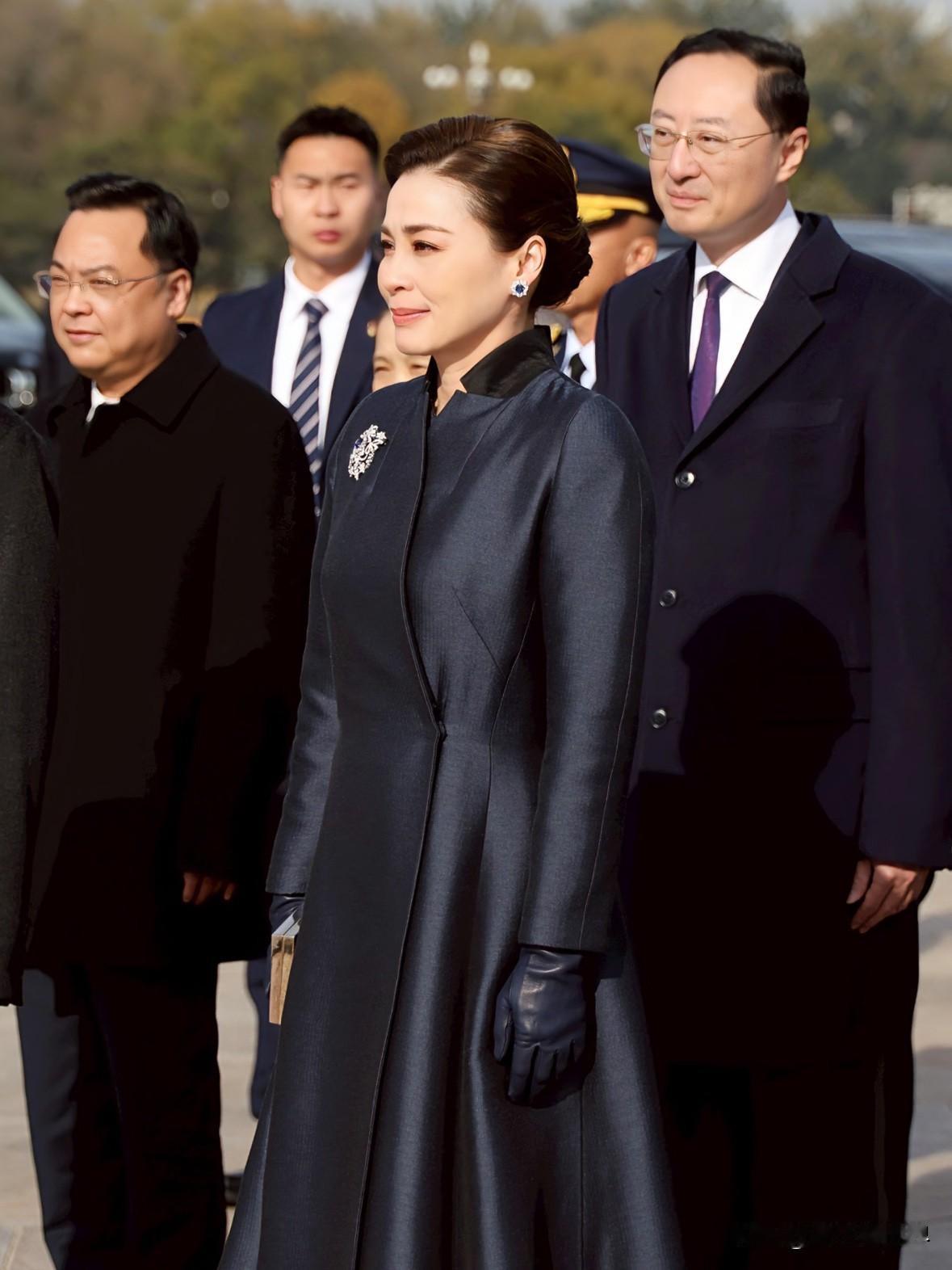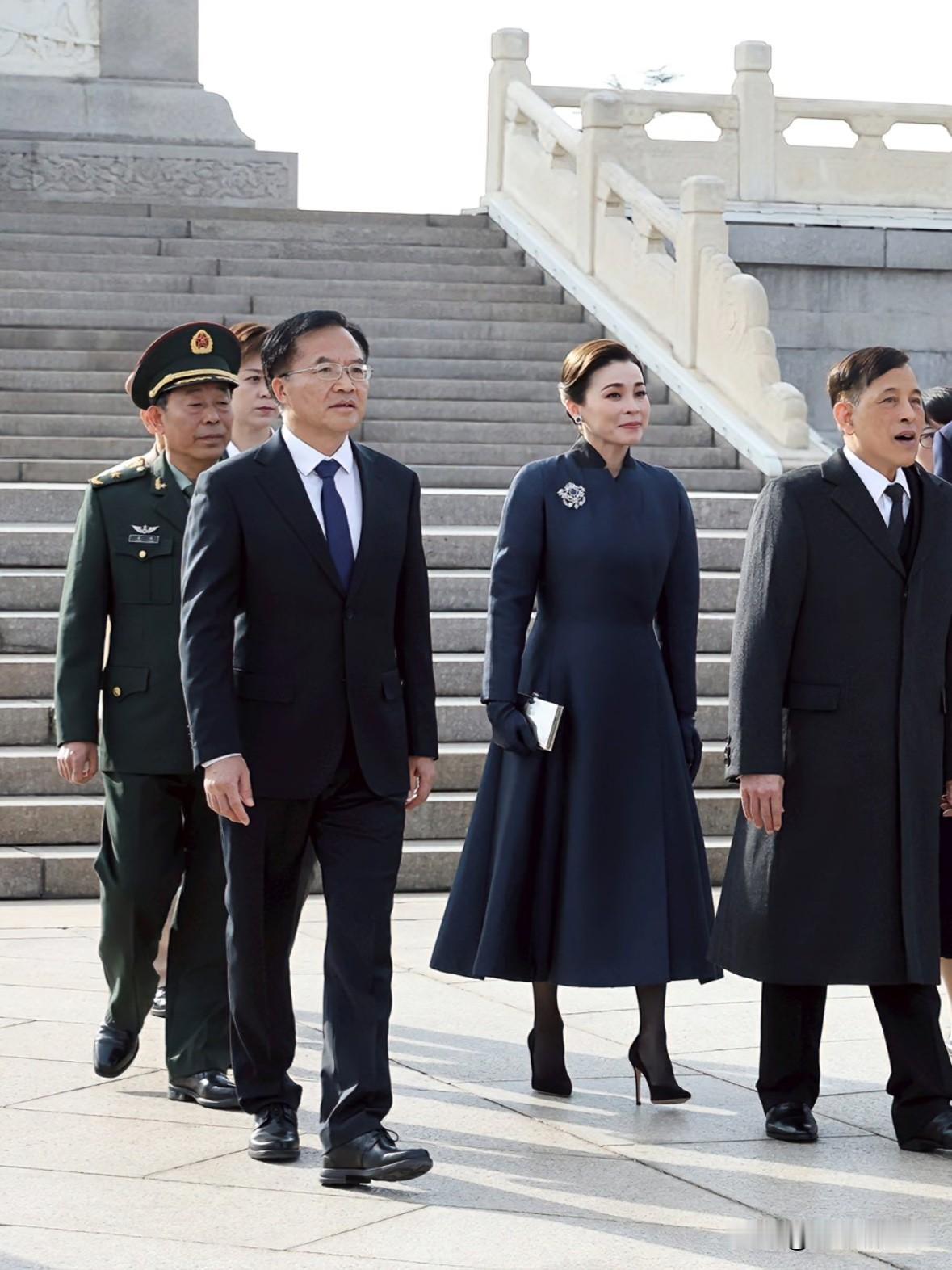 苏提达王后随泰王现身天安门广场,47岁的王后身材纤细且挺拔,藏蓝色裙摆式礼服巧妙地修饰了她的身形,搭配蓝宝石耳环,举手投足间尽显从容大气 此次她所着礼服采用泰国顶级丝绸制成。那莹润光泽的藏蓝色,乃是泰国王室专属的“王的颜色”。 垂坠感十足的面料,随着她的步伐轻轻摆动,灵动之中尽显庄重。礼服的设计更是暗藏匠心。 立领与盘扣借鉴了中国传统服饰的细节,衣身用银线绣着“奔通花”图腾(泰国象征纯净的莲花纹样),与中国青花瓷的淡雅意境殊途同归;