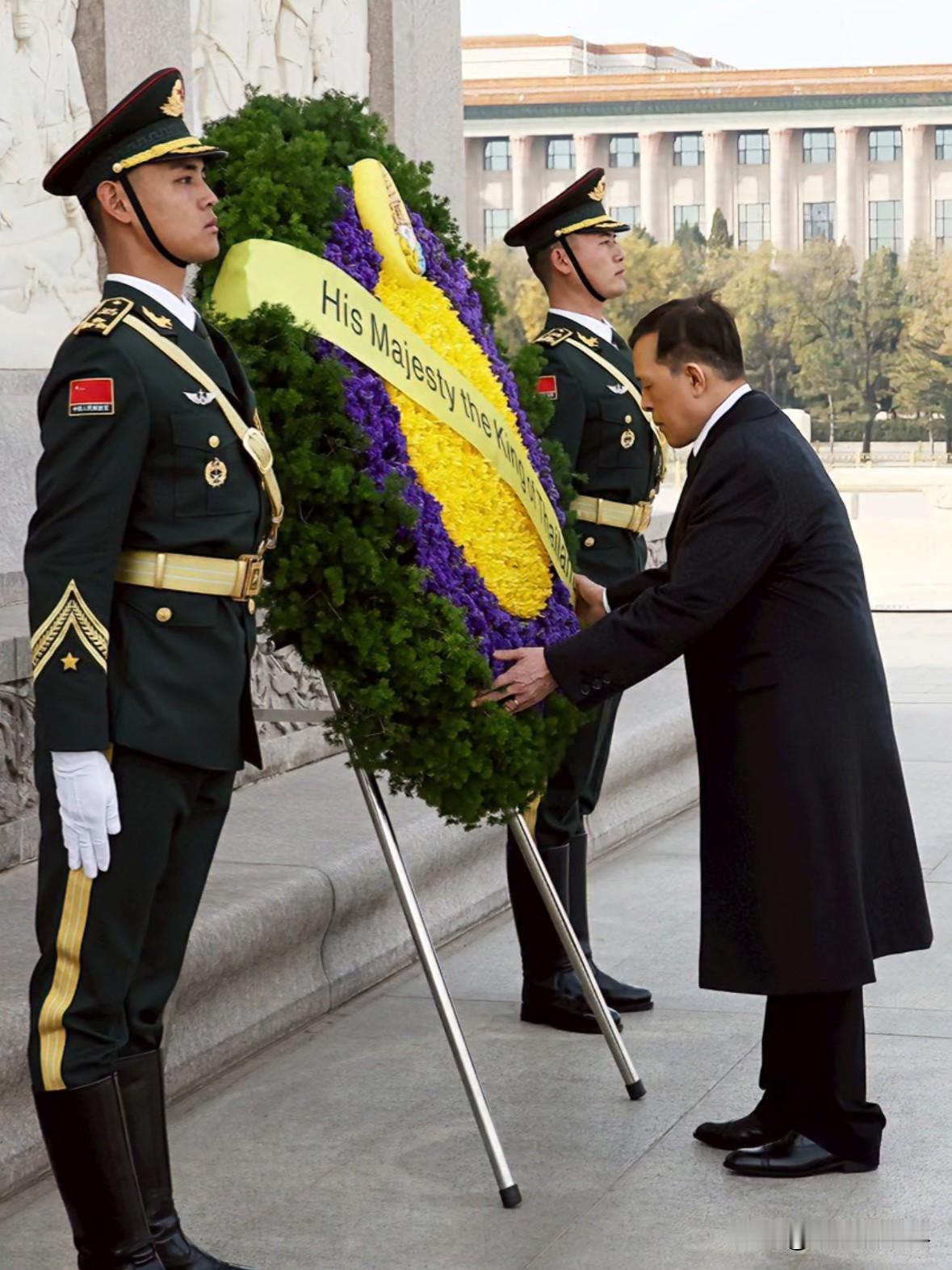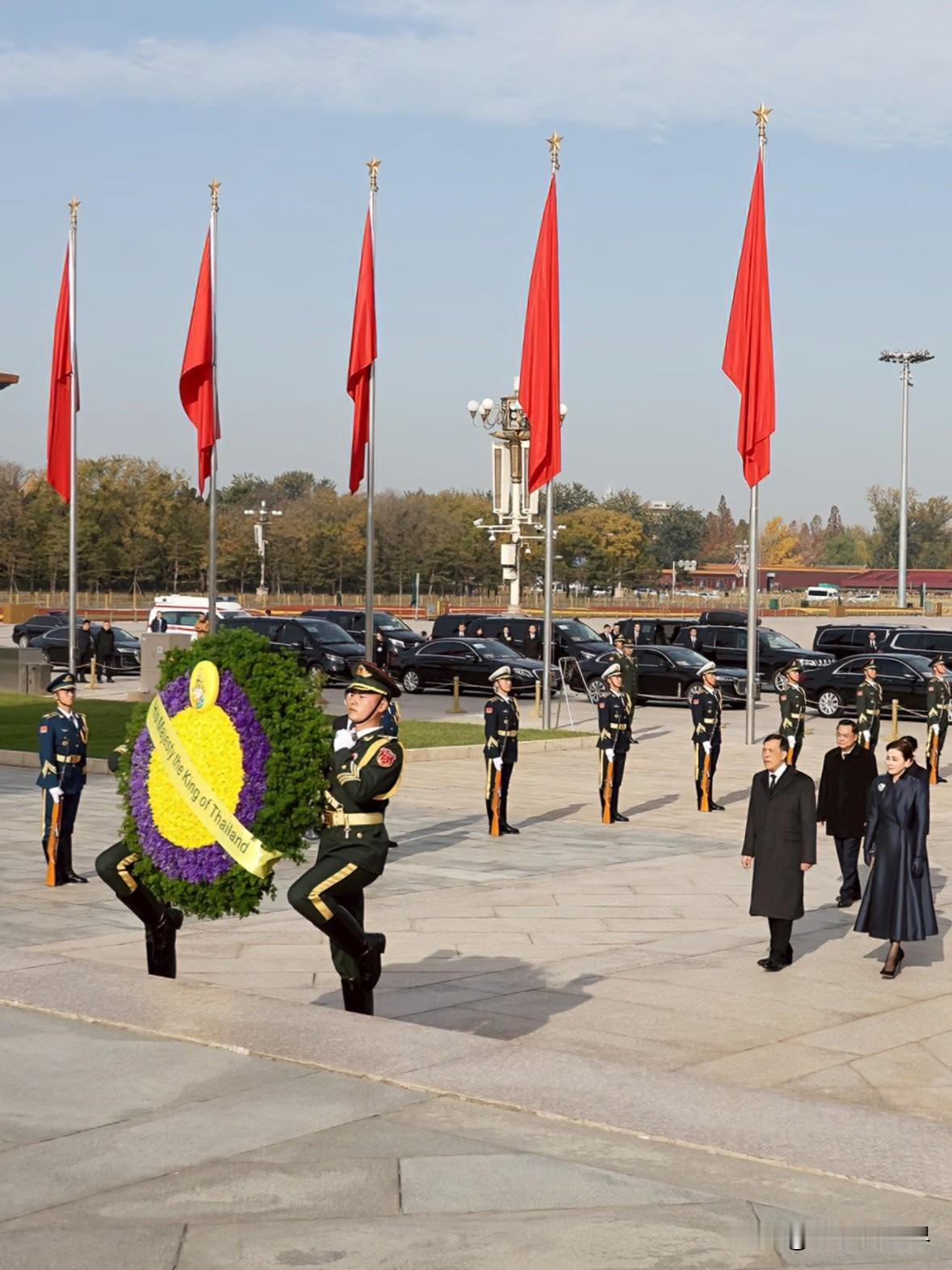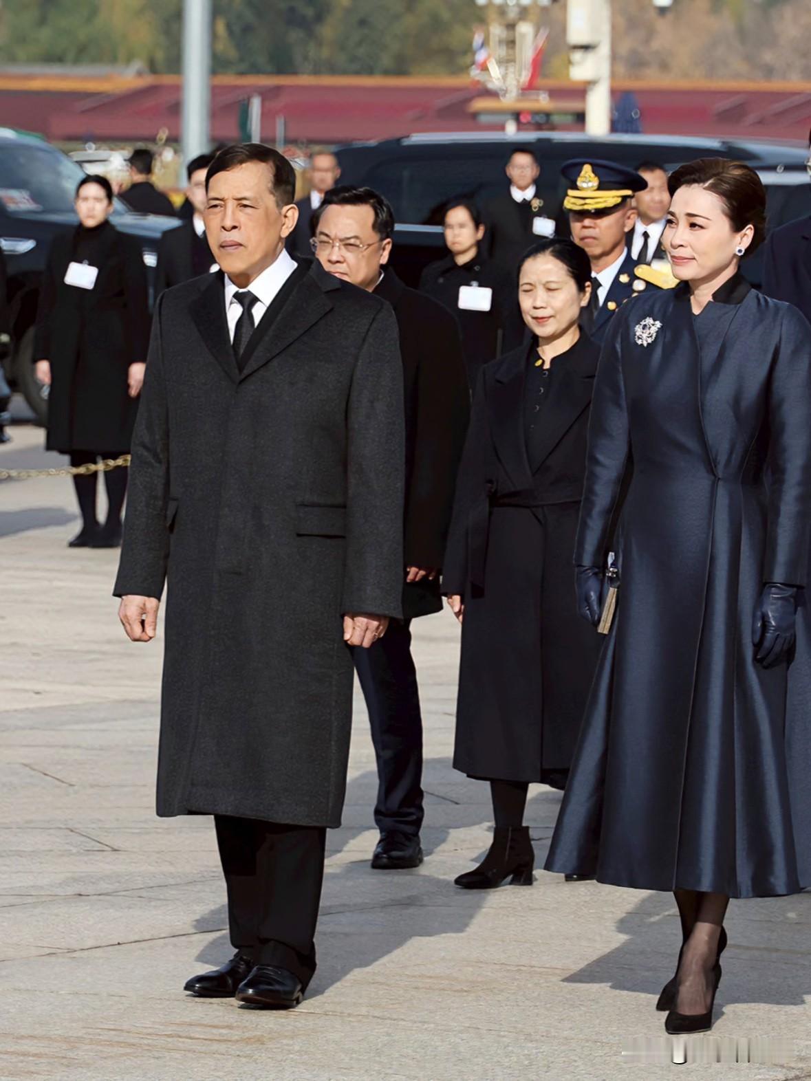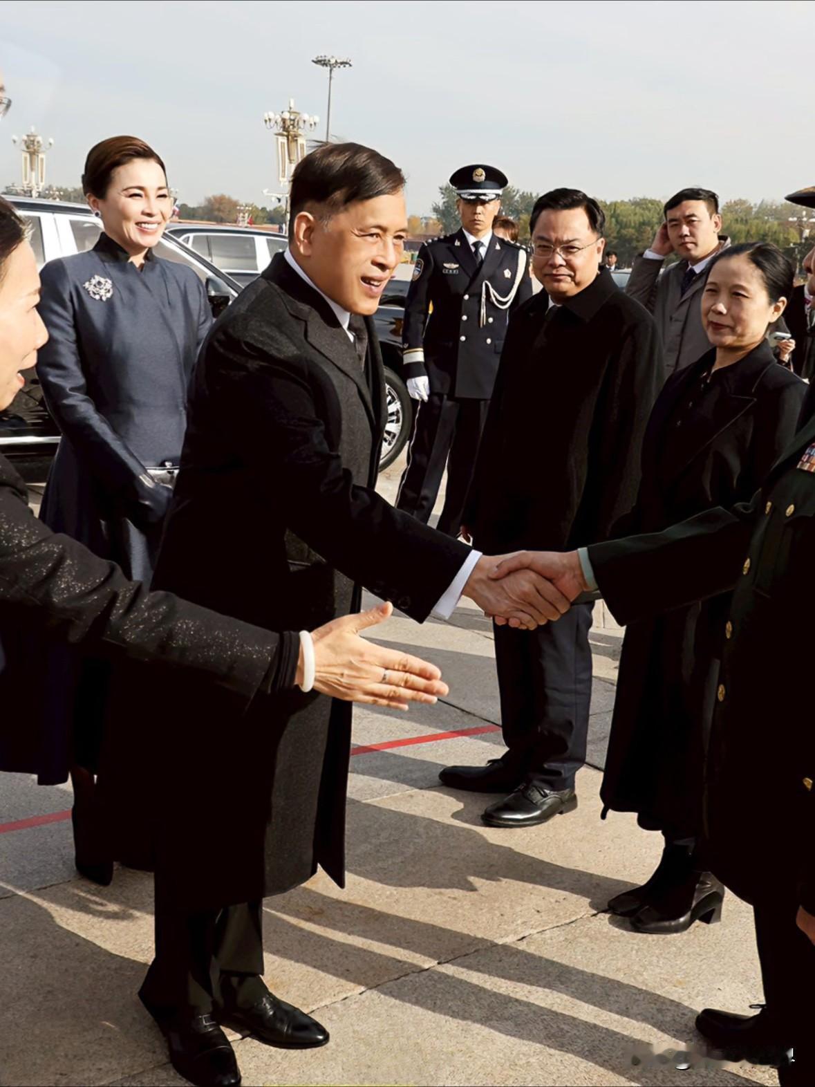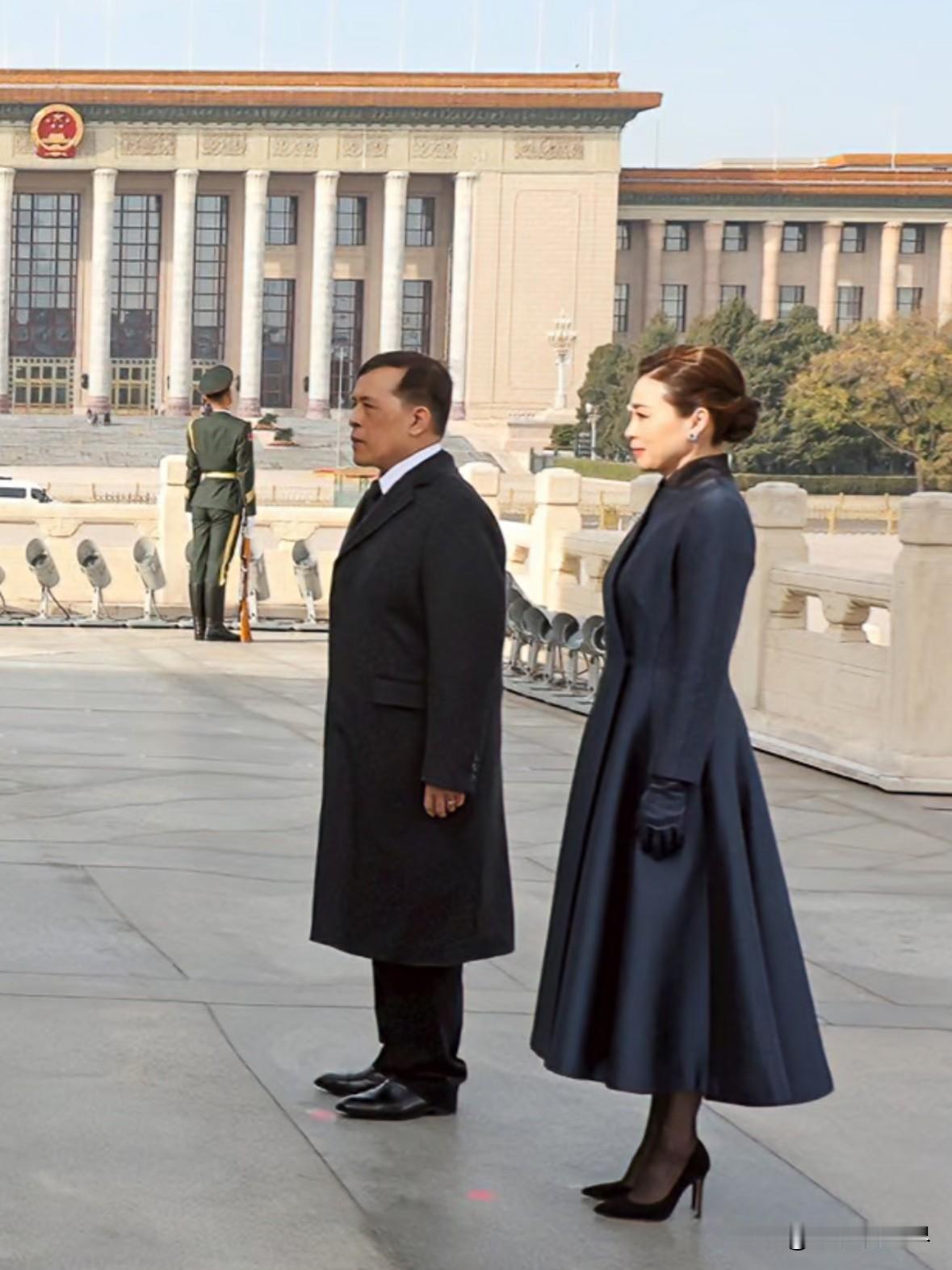 苏提达王后随泰王现身天安门广场,47岁的王后身材纤细且挺拔,藏蓝色裙摆式礼服巧妙地修饰了她的身形,搭配蓝宝石耳环,举手投足间尽显从容大气 此次她所着礼服采用泰国顶级丝绸制成。那莹润光泽的藏蓝色,乃是泰国王室专属的“王的颜色”。 垂坠感十足的面料,随着她的步伐轻轻摆动,灵动之中尽显庄重。礼服的设计更是暗藏匠心。 立领与盘扣借鉴了中国传统服饰的细节,衣身用银线绣着“奔通花”图腾(泰国象征纯净的莲花纹样),与中国青花瓷的淡雅意境殊途同归;