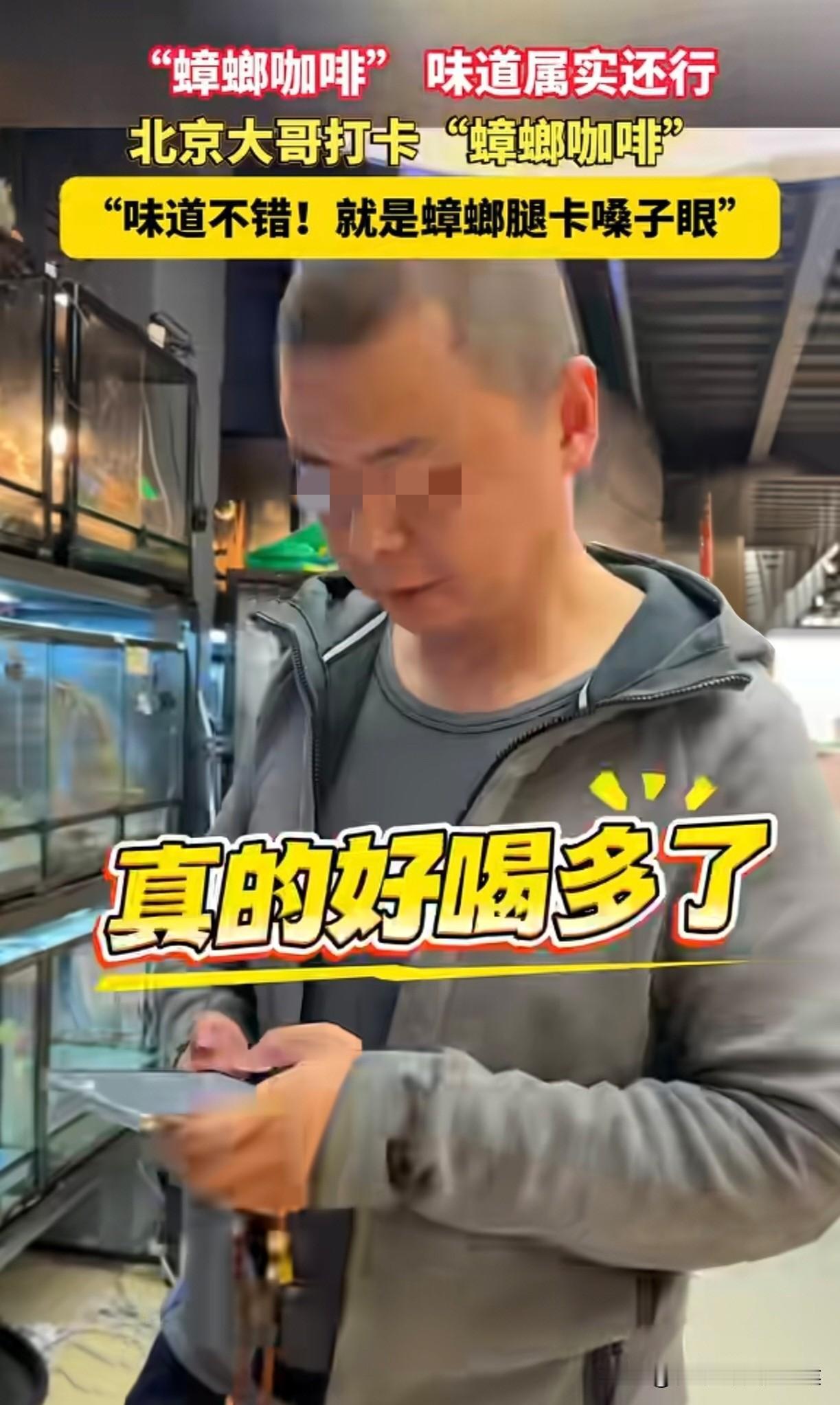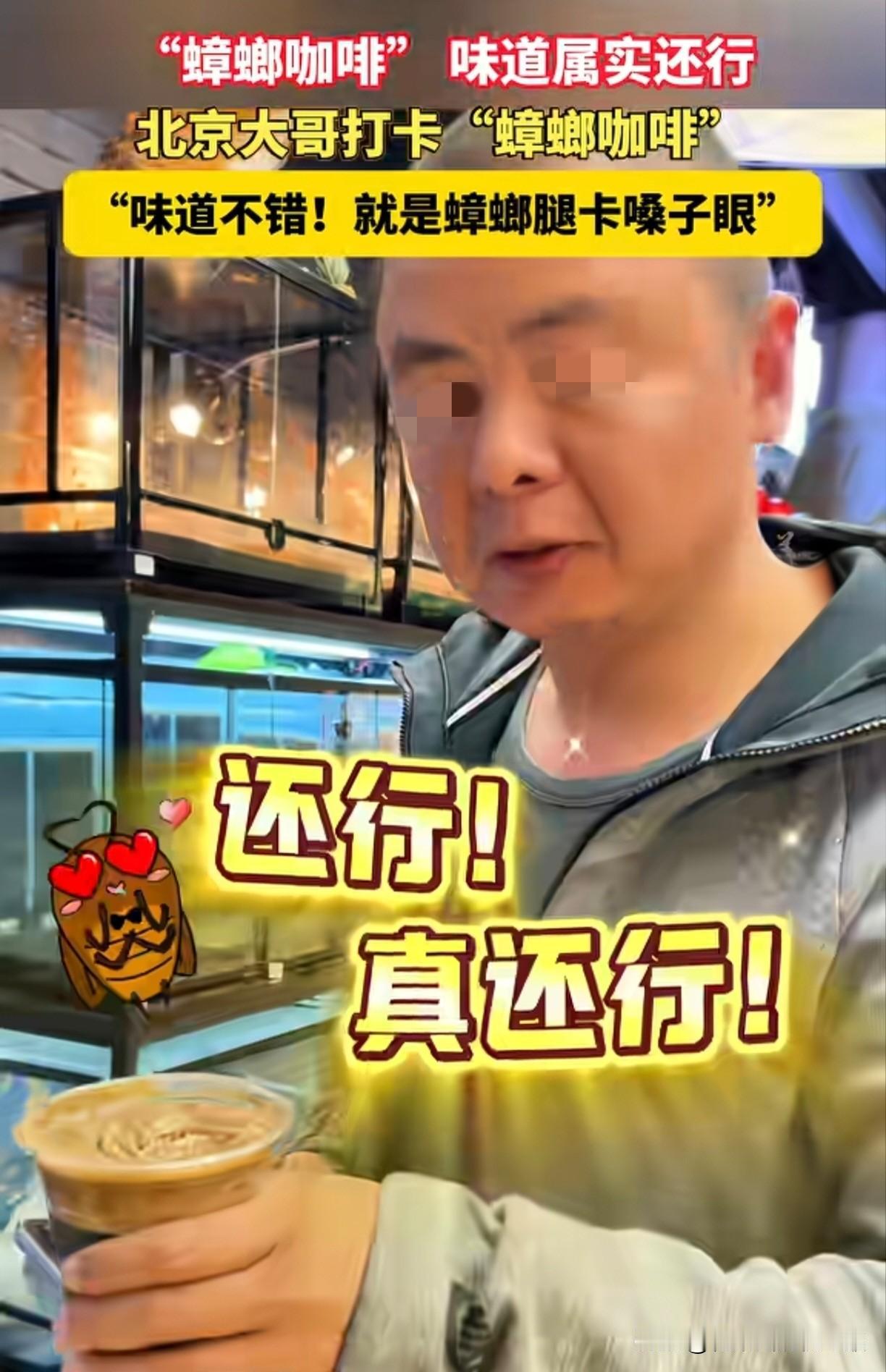 听过猫屎咖啡,象屎咖啡,我还第一次听说蟑螂咖啡。看到一北京大哥打卡蟑螂咖啡,表示味道还行,挺好喝的,唯一的问题可能就是蟑螂腿有点卡嗓子眼[笑哭]。 就我所知,蟑螂不是害虫吗?适应性强,繁殖快,素有“打不死的小强”之称,而且会传播各种疾病,这个还能吃嘛? 不得不承认,人的的想象力是无限的。别的餐厅有蟑螂,是卫生不合格。这个店里有蟑螂,全是真材实料呀。据说这个蟑螂咖啡45块一杯,如果是你,你愿意尝试一下嘛[泪奔]。社会百态 蟑螂 咖啡