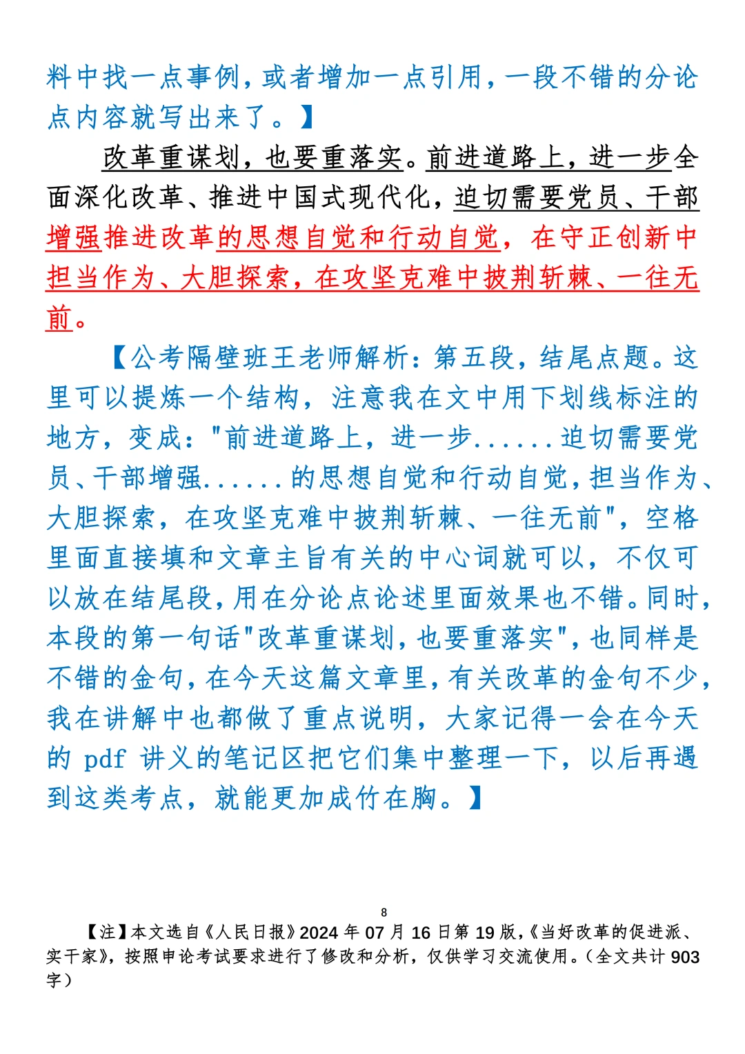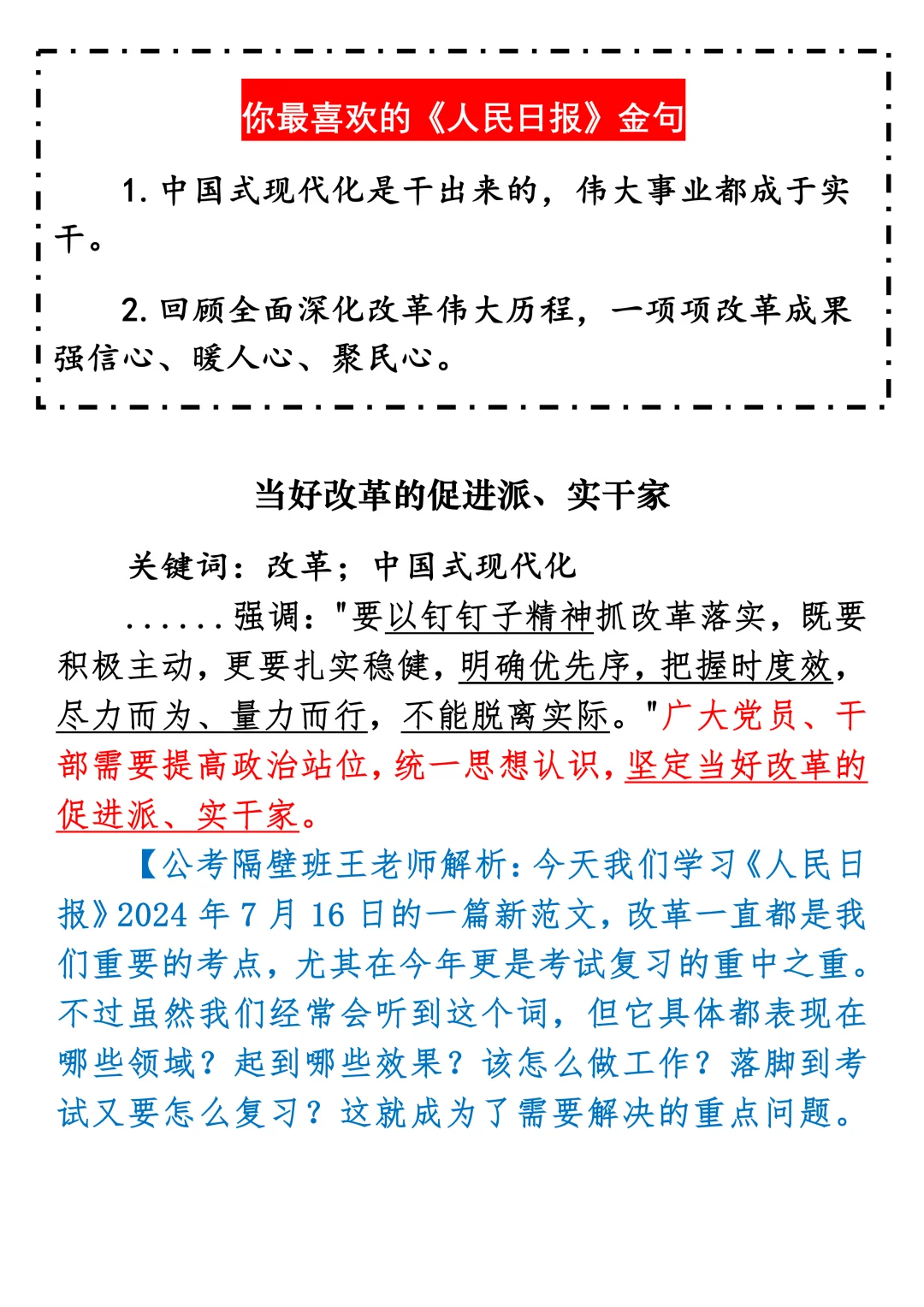 如何抄写:每日抄写文章发在“公考隔壁班王老师”账号,红色字是重点句和结构句,黑色字是正文,蓝色字是解析,大家抄写时不必抄蓝色字。建议先通读全文,做到心中有数再开始抄写,效果会更好。关于文章:抄写文章来源于人民日报,但每篇文章我都根据申论考试要求进行了修改:一是重写或修改开头、结尾;二是统一段首句句式结构;三是调整段落字数,使文章结构更均衡;四是简化复杂长难句,使之更具可模仿性。每篇文章无论修改多少,都是基于申论考试要求,毫无对人民日报文章品评之意。(此处致敬人民日报)申论 遴选 公务员