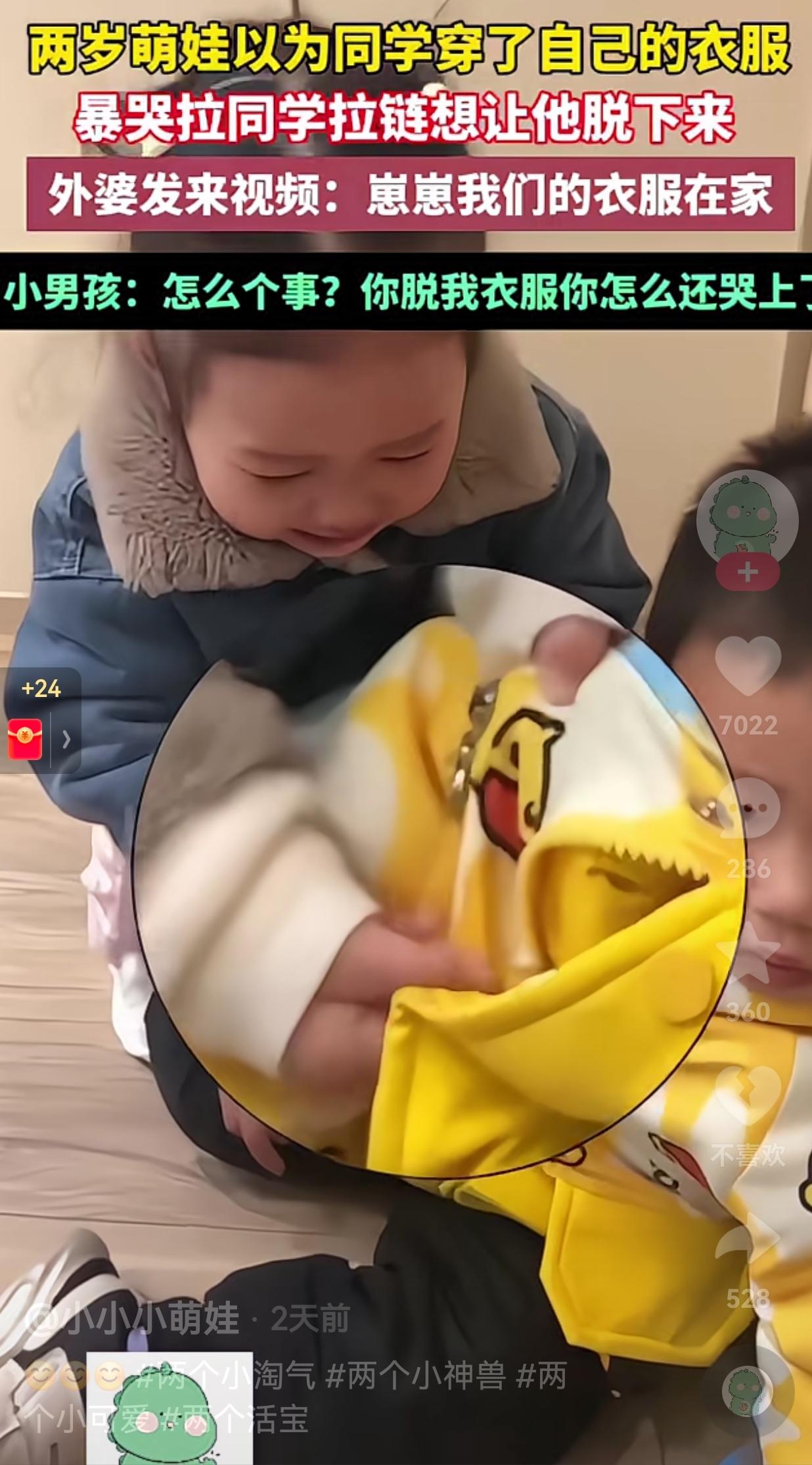 笑不活了!两岁萌娃看到一位男同学的衣服跟自己的一件衣服一模一样,就误以为同学穿了自己的衣服。 这还了得,萌娃直接崩溃大哭,不仅如此,萌娃还拉同学的拉链,想让他赶紧将衣服脱下来。 小男孩虽然有些迷惑,也有点不知所措。可是,情绪还是挺稳定的,一直没有哭泣。 幼儿园老师看到后,赶紧上前劝说,对萌娃说:“你的衣服在家里呢?这不是你的衣服。” 萌娃根本考虑不了那么多,无论如何,也要让男同学把衣服脱下来还给自己。 万般无奈之下,老师跟萌娃的家长打去了电话,电话那头,外婆向萌娃展示了同款衣服,萌娃这才知道男孩的衣服不是自己的。并停下了手中的动作。 网友看到后评论说,小孩看见一模一样的都以为是自己的,我家小孩看见人家有和她同样的小鸭果冻车,她看见了就一直指一直不走,劝了好半天才走! 还有的网友说,小男孩虽然不理解,但是,情绪一直很稳定。面对同学的无理取闹,他始终不哭不闹。 看来家长给孩子穿衣服,也要小心一点,不要给孩子穿同款衣服孩子太小了,不懂事,有时候因为一些小事,真的容易引发不必要的争端。 大家觉得呢?欢迎大家评论区讨论留言。