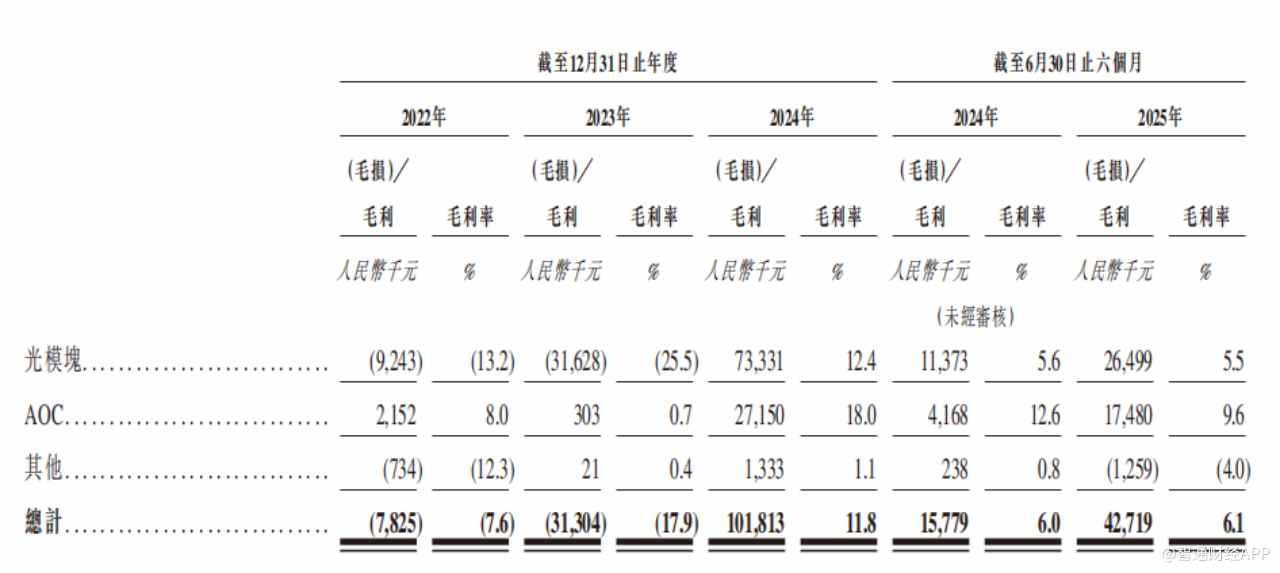 产品收入结构上,光模块为公司核心收入来源,2022-2024年及2025年上半年收入占比分别为68%、70.6%、68.5%及69.3%;AOC产品占比在12.5%-26.3%之间波动,2025年上半年达26.2%;其他产品(主要包括光电元件及原材料)占比相对较小,2025年上半年为4.5%。