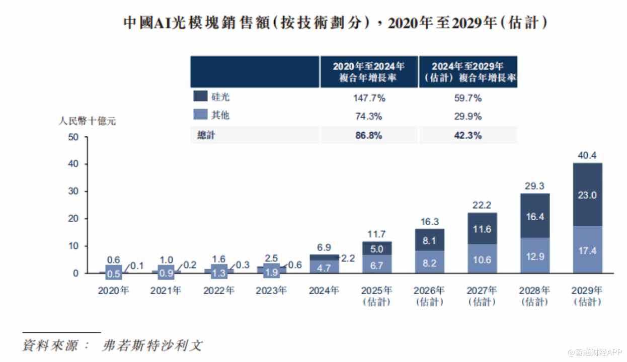 中国市场受益于“东数西算”工程推进及国内AI数据中心建设加速,AI光模块市场规模由2020年的6亿元增长至2024年的69亿元,复合年增长率86.8%,预计2029年将达404亿元,2024-2029年复合年增长率42.3%。其中,硅光子光模块作为下一代技术方向,中国市场规模预计2029年将达230亿元,2024-2029年复合年增长率高达59.7%。