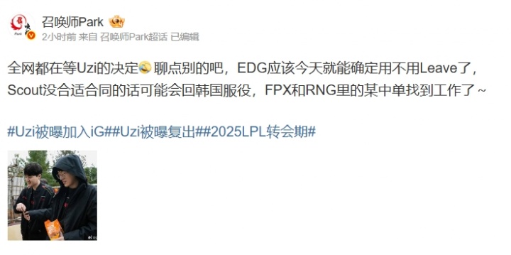 微博原文:全网都在等Uzi的决定,聊点别的吧,EDG应该今天就能确定用不用Leave了,Scout没合适合同的话可能会回韩国服役,FPX和RNG里的某中单找到工作了~