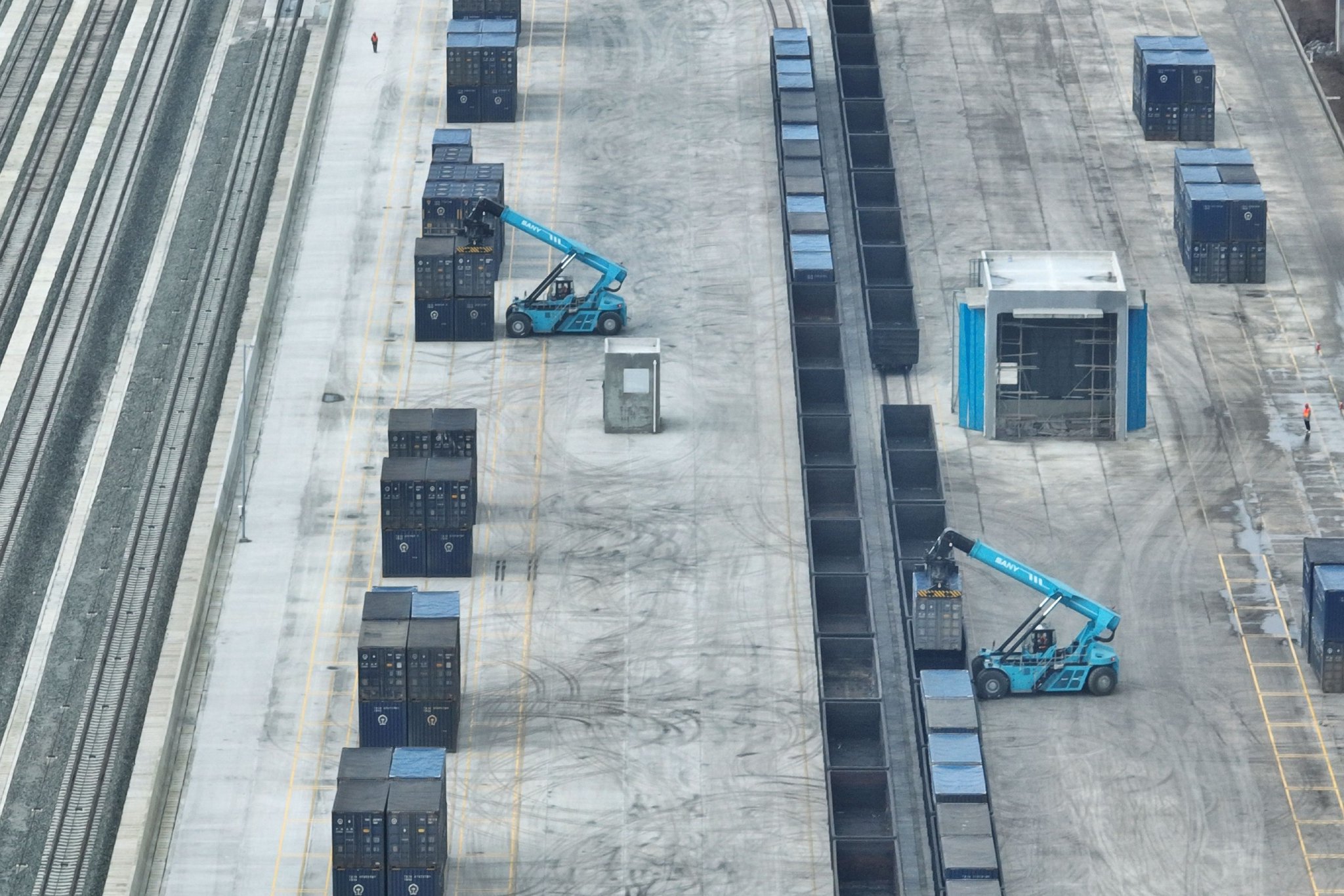 11月15日,在贵州省六盘水市水城能投铁路专用线,两台集装箱正面吊装机正在进行装车作业。王波摄