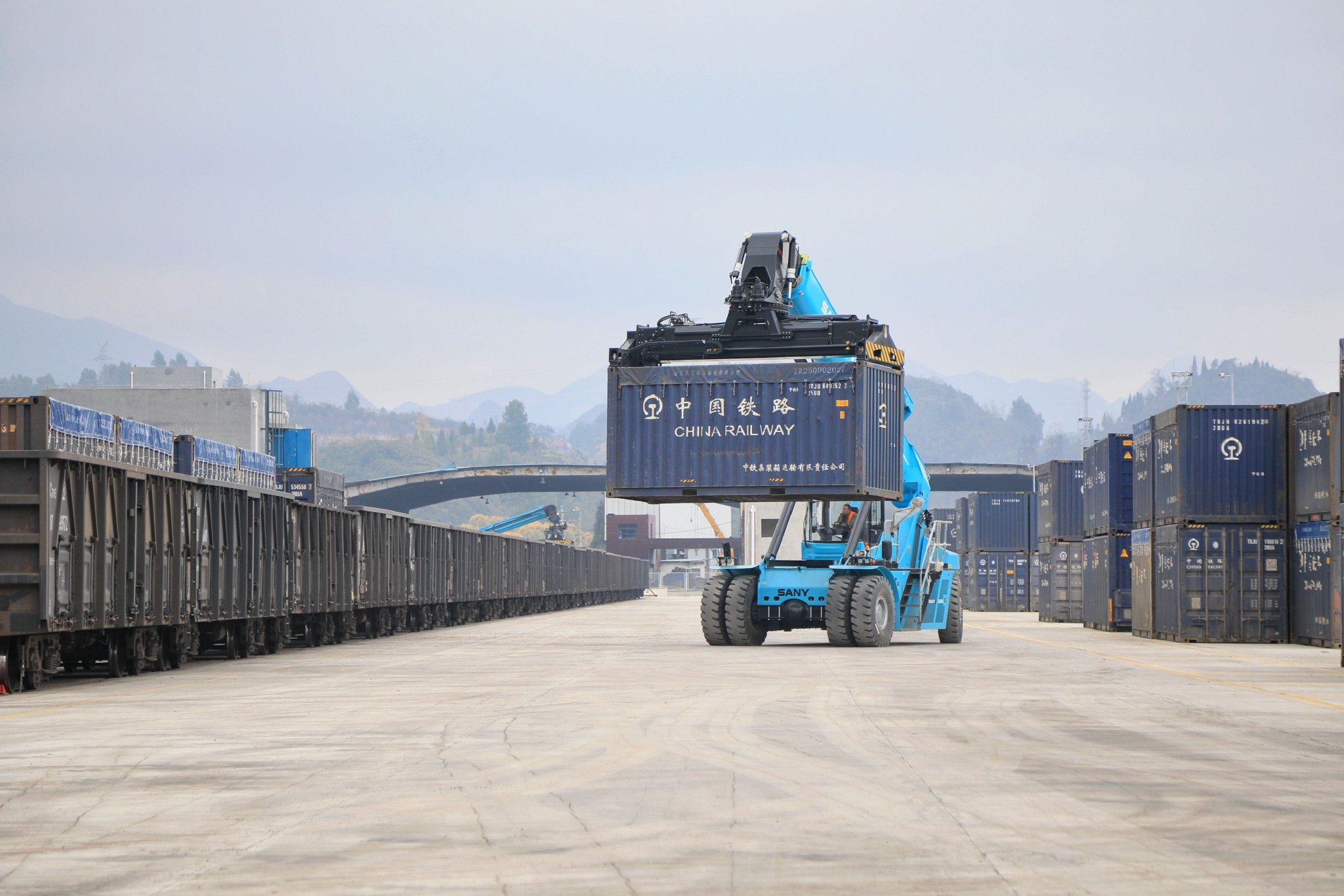 11月15日,在贵州省六盘水市水城能投铁路专用线,集装箱正面吊装机正在进行装车作业。王波摄