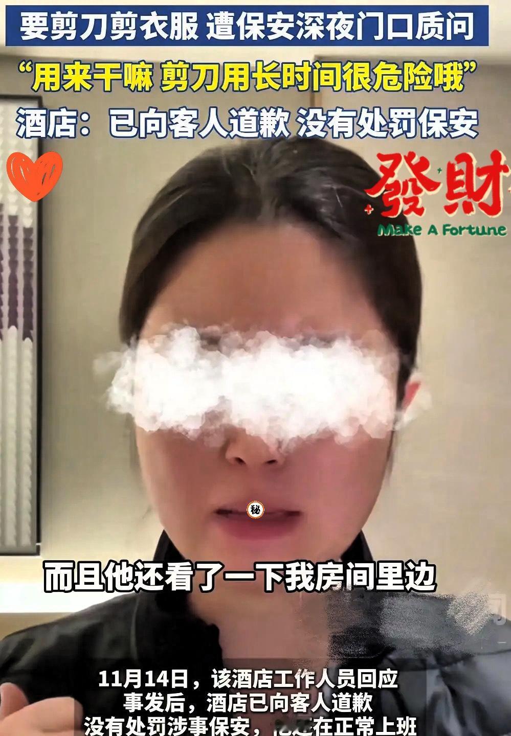 这下彻底火出圈!不止甘肃,全国网友都在聊这事儿。 女子住兰州酒店借剪刀剪衣服,保安多问了两句“干啥用”“别用太久”,还在门口等着,她气不过发视频控诉保安“管太多、态度差”,结果反倒被全网吐槽“好心当成驴肝肺”。 真不是网友双标,酒店借剪刀本就有风险,保安多留意是负责任,怕的是有人拿工具寻短见,酒店要担责啊。 现在的服务业太难了,不借怕被投诉,借了不设防又可能出大事,多问两句怎么就成了“找事”? 其实换位思考下,保安的谨慎不是针对谁,而是对所有人的安全负责。 你觉得保安的做法过分吗?如果是你借剪刀,能理解这种“多此一举”吗?评论区说说~