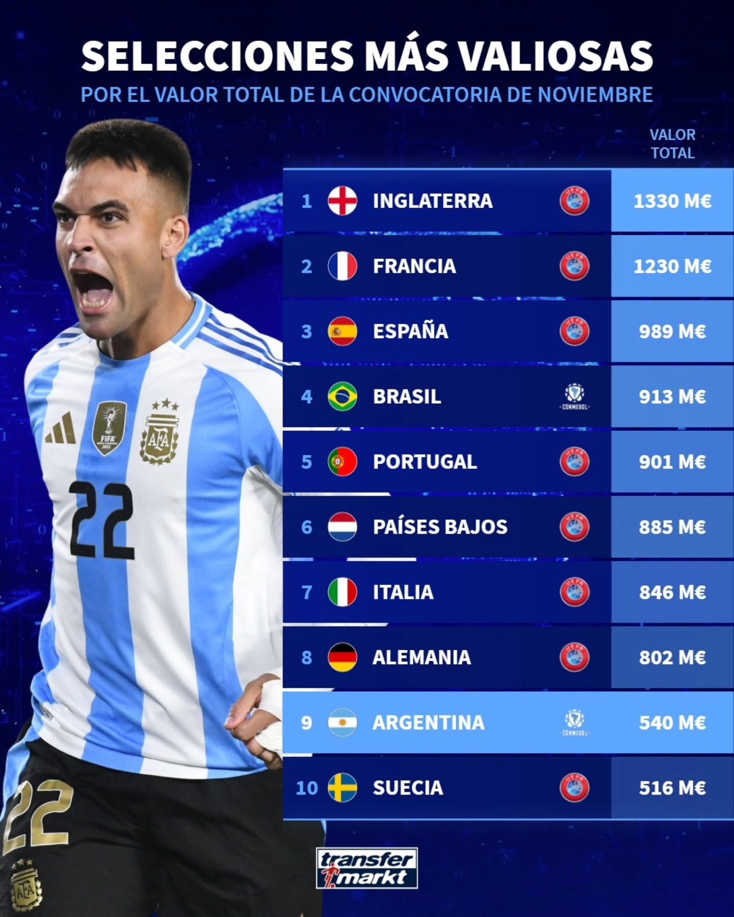 虎扑11月16日讯德国转会市场统计了本月国际比赛日身价最贵的国家队,详情如下:
