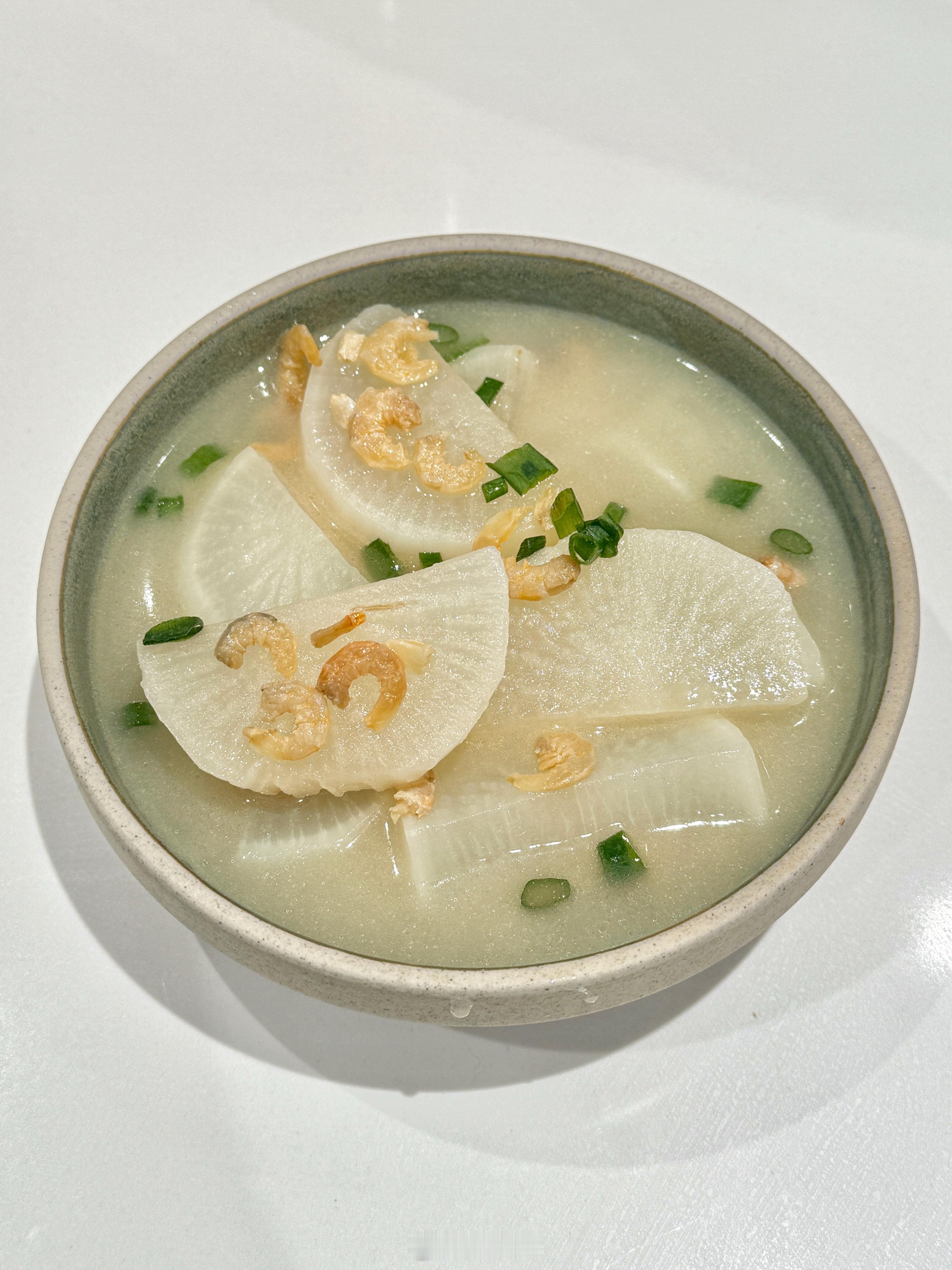 俗话说冬吃萝卜夏吃姜!一个超简单又好吃的萝卜做法分享给大家。白萝卜切厚片,用猪油煎一下,加入开水下入虾米,煮沸后转中小火炖15分钟左右,出锅撒点葱花点缀即可,可以稍加一点盐调味,虾米本身带咸,不要加多了。