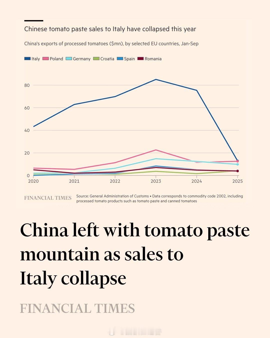 新疆番茄酱出口暴降八成FT报道,中国新疆番茄出口产业承受巨大压力。这个曾占全球番茄酱市场15%份额的最大出口国,在2025年遭遇前所未有的危机——对欧洲的出口暴跌超过80%,数万吨番茄酱堆积在港口冷库,形成业内所谓的”番茄酱山”。新疆凭借理想的气候条件和极低的生产成本,在过去十年间迅速崛起为全球番茄加工中心。2024年,中国加工了1100万吨鲜番茄,其中80%以上来自新疆。令人意外的是,意大利——这个以番茄闻名的国家——却是新疆番茄酱的最大买家,意大利市场占新疆番茄出口总量的20%,每年出口额超过8000万美元。意大利进口商找到了全新的商业模式,Petti等厂商将中国番茄酱与本地番茄混合,重新包装为”意大利制造”销往欧洲各地,实现翻倍的利润。但2024年开始,一系列政治因素导致了新疆番茄出口开始承受重压。一方面是欧美指责新疆存在强迫劳动,意大利退出中国”一带一路”倡议,双边贸易关系发生明显变化。另一方面是意大利农业保护组织Coldiretti发起抵制新疆番茄运动,施压抵制本国商家用新疆番茄冒充意大利番茄。欧洲消费者开始质疑货架上”意大利”番茄酱的真实来源。多家超市暂停供应相应。数据显示,2025年前9个月中国对意大利的番茄酱出口从7500万美元暴跌至仅1300万美元。中国番茄加工量预计从1100万吨骤降至370万吨。——————不过与美国豆农不同的是,中国有一个巨大的市场,或许可以通过提振内需来消化这些番茄酱?