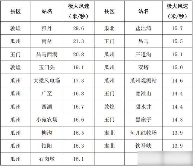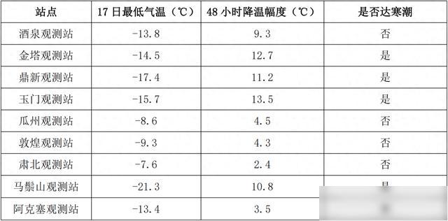 受强冷空气影响,15日至17日,酒泉市出现降温、大风天气。至17日8时,肃州区、金塔县、玉门市和肃北县北部(马鬃山镇)48小时最低气温降幅9℃~14℃,肃北县北部(马鬃山镇)和金塔县东北部(鼎新镇)达寒潮标准,金塔县和玉门市达强寒潮,最大降幅出现在玉门观测站,为13.5℃。瓜州县、敦煌市、肃北县和玉门市局地出现大风,极大风速出现在敦煌雅丹国家地质公园,为29.6米/秒(十一级)。具体实况如下: