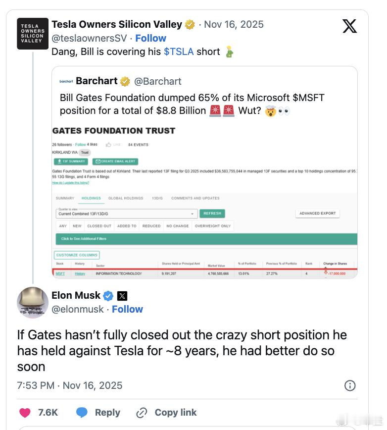 马斯克向比尔·盖茨发出最后警告马斯克和比尔·盖茨之间的恩怨持续了很多年,几年前的马斯克传记中写道过,盖茨一直对特斯拉这家公司持怀疑态度,有一次他希望缓和与马斯克关系,在一个慈善项目上与之合作,当时他向马斯克坦白了一件事,自己投了5亿美元做空特斯拉股票。这件事让马斯克非常愤怒,做空特斯拉股票本质上意味着盖茨押注特斯拉股价下跌,从而获利。然而,特斯拉股价过去五年累计涨幅接近150%,比尔·盖茨肯定是没赚到啥钱,不过两个人的梁子算是结下了。在盖茨基金会抛售了近90亿美元65%的微软股份后,马斯克向他发出了最终警告:尽快平仓特斯拉空头头寸,否则后果自负。当然,这句话也可以看作是善意提醒,警告盖茨未来可能面临的风险,毕竟特斯拉股价一直在涨,如果他真的想让盖茨尝尝厉害,就不会提前通知他平仓了。