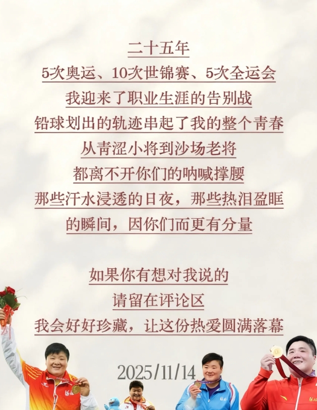 在两天前,巩立姣就在社媒发文表示:二十五年,5次奥运、10次世锦赛、5次全运会。我迎来了职业生涯的告别战,铅球划出的轨迹串起了我的整个青春,从青涩的小将到沙场老将,都离不开你们的呐喊撑腰,那些汗水浸透的日夜,那些热泪盈眶的瞬间,因你们而更有分量。