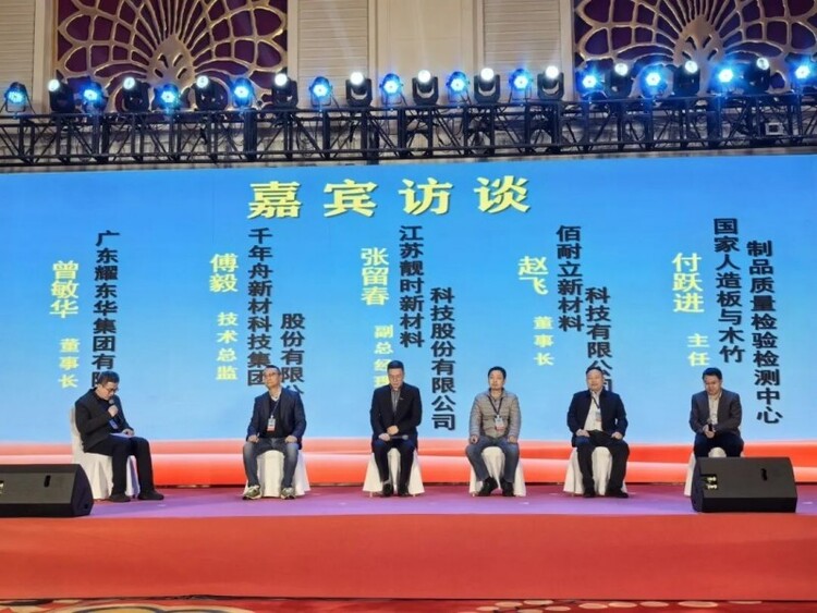 在由中国林科院木材工业研究所常亮研究员主持的嘉宾访谈环节中,耀东华集团董事长曾敏华先生与其他四位行业大咖,围绕“提质赋能”主题展开深度对话。曾敏华指出,耀东华始终将绿色环保与产品品质视为企业生命线,持续加大研发投入,推动饰面材料与基材的融合创新,助力客户实现产品升级与价值提升。