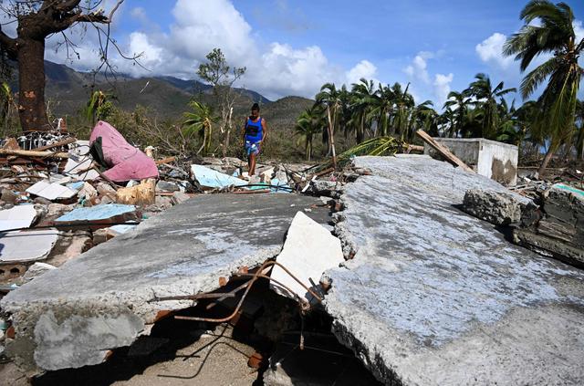 2025年10月30日,古巴圣地亚哥德古巴省博卡德多斯里奥斯村,一名妇女走在飓风“梅利莎”经过后被毁坏的房屋残骸中。(法新社)
