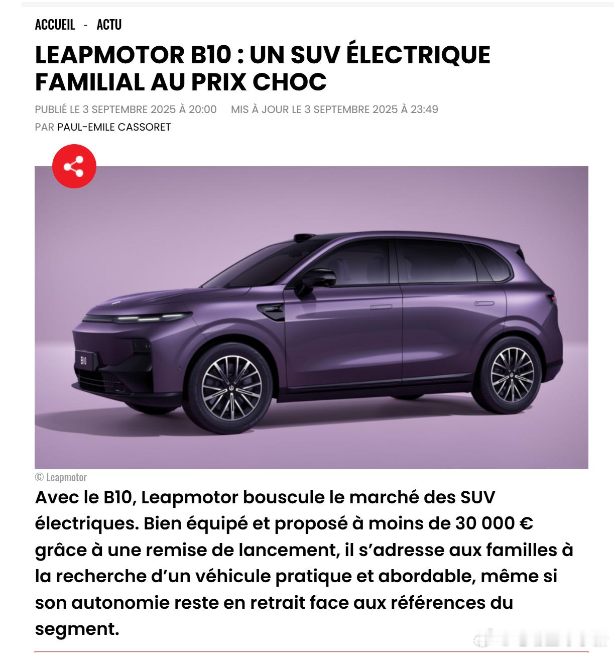 上周零跑提前完成50万年销量目标,其实有一个隐藏的关键因素:海外市场。当国内新能源竞争进入下半场,怎么率先把优秀的中国车卖到全球,就成为了销量再上一层楼的核心。举个例子,B系列首款车型,就是全球化SUV B10。它在今年4月国内上市之后,9月份马上登陆德国慕尼黑车展,今年就要登陆全球超过20个国家地区的市场。从B10的全球速度上,就可以看到零跑今年的厚积薄发。进军全球不可能只喊口号,事实上做全球车型极其困难,法规、测试都要在全球市场执行。譬如零跑B10开发之初,就必须满足全球53个国家/地区的法规和标准。为此零跑甚至建立了海内外的国家/地区气象库,涵盖了以上53个国家/地区的195个城市的地理、气候、气象、道路状态等等。以近几年中国车企重点攻坚的欧洲市场为例,欧洲对座舱的环保标准要求极其严格,零跑B10的车内座舱就按照「零甲醛」的技术规范打造,通过了欧盟环保标准认证。而这一切开发进程,都是在零跑还没有如今引爆市场的销量之前进行的,这就是前面我们提到的厚积薄发。再然后,才有了零跑把600公里续航、激光雷达、8295芯片、越级空间等等卖点带到欧洲市场的结果。截止到目前,B10的国内销量已经超过了8万台,11月初也正式全面登陆欧洲市场。西班牙汽车门户autonoción、法国汽车门户l'auto-Journal等等超过280家欧洲汽车媒体都有一系列报道和测试。其中l'auto-Journal评价B10为「吸引务实的居家男性」、「空间充足」、「舒适平顺」;autonoción则评价B10拥有「高科技的内饰」,以及「全面的辅助驾驶系统」。另外,衡量一款优秀全球车型的维度,还包括「拿奖」。截止到目前,B10已经拿到了Muse铂金奖、美国好设计奖铂金奖伦敦设计奖金奖、法国设计奖金奖等等一系列设计大奖,十年前默默耕耘的中国新造车,正在造出全球受好评的电动汽车。二十年前,卡罗拉、帕萨特是畅销全球市场的熟悉名字;下一个二十年,中国电动汽车已经开始走同样的道路了。