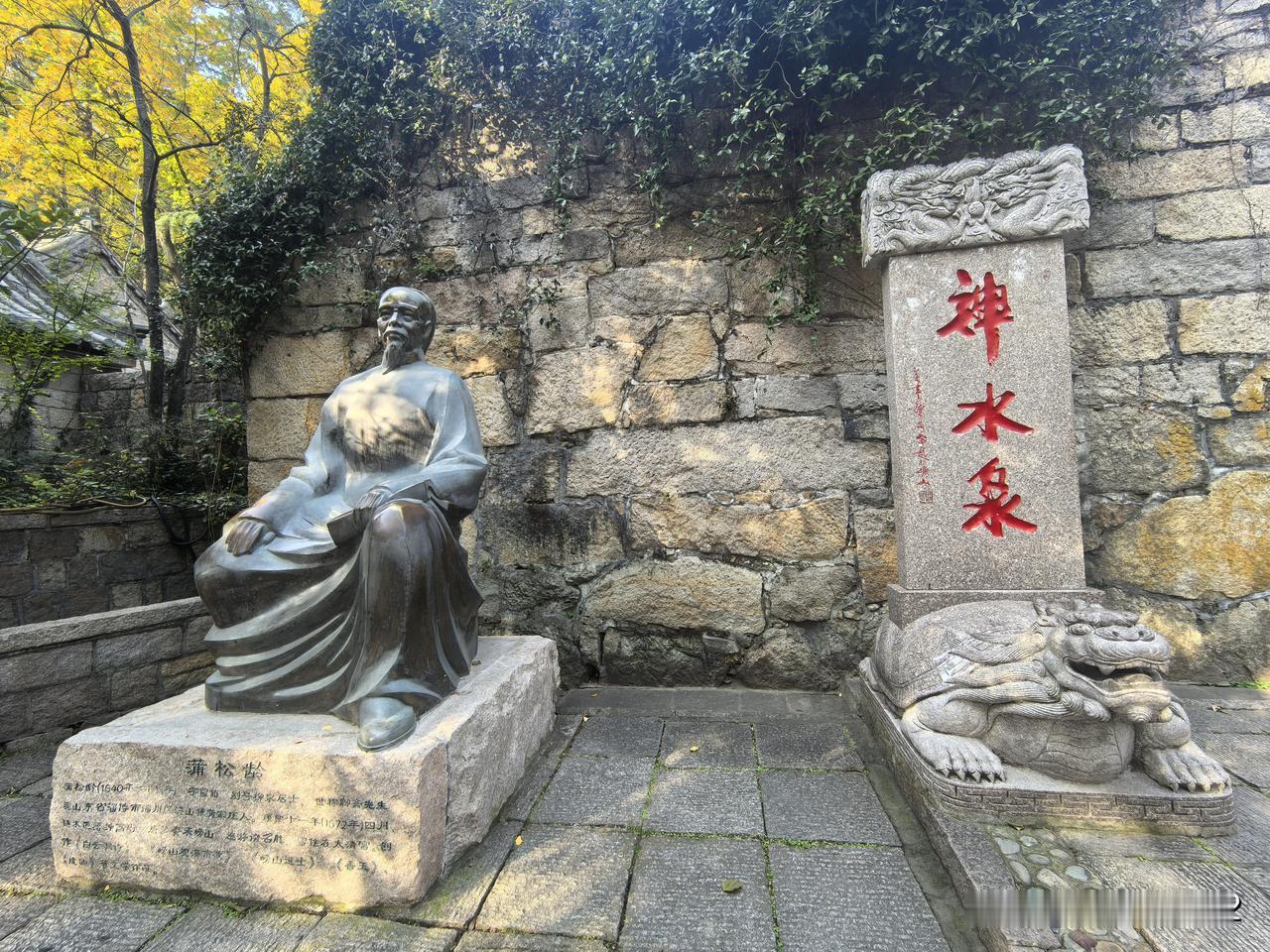 崂山太清宫园内以神水泉为中心,周围珍稀古树木有百余棵,每到秋天来赏秋和拍照的人特别多。 图5:两个摄影爱好者拿着照相机,正在商量最佳拍摄角度。 图六神水泉正面拍摄效果图,相传“神水泉”这三个字,是宋代华盖真人刘若拙的亲笔手迹。 为什么叫神水泉呢? 它的神奇之处就在于大旱三年不干涸,大涝三年不溢出。无论旱涝,水位始终保持稳定。