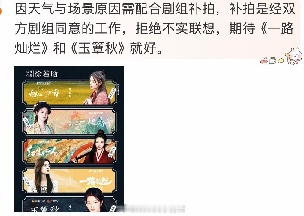 徐若晗家澄清:因天气与场景原因需配合剧组补拍,补拍是经双方剧组《一路灿烂》和《玉