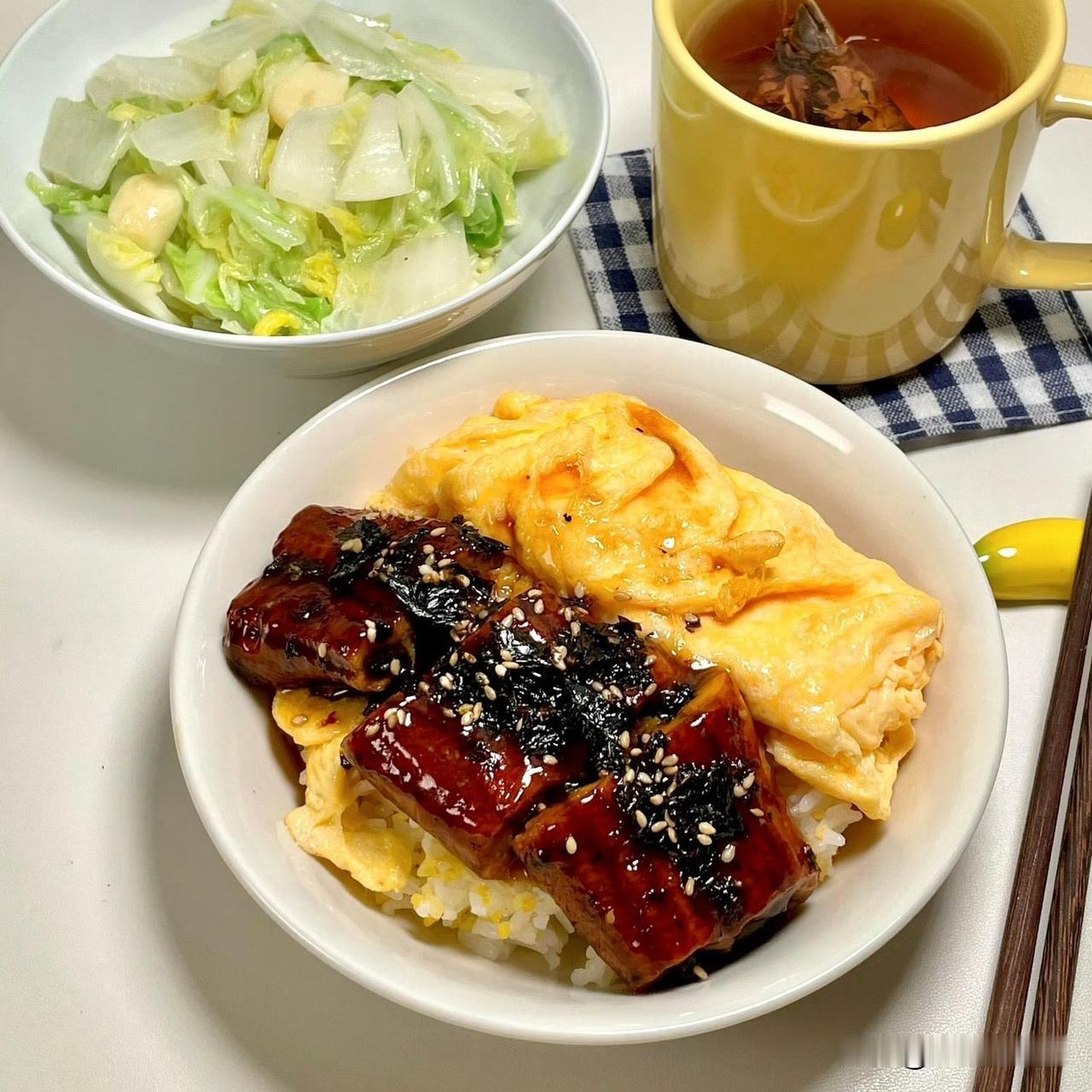 今日餐桌,是两份扎扎实实的满足:一份是裹着亮泽酱汁的肉和鹌鹑蛋,配着紫米饭与青菜;另一份是甜润的烧肉盖在蛋炒饭上,佐着清炒白菜和热茶。每一筷都裹着家常的暖。