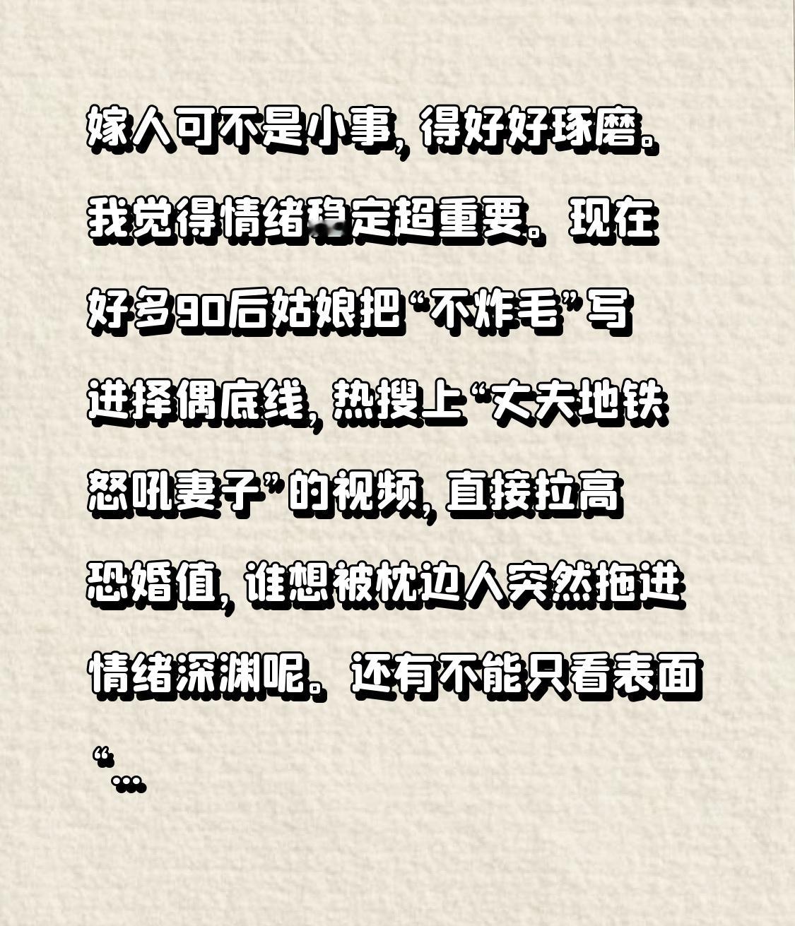 嫁人绝非小事,得慎重考量。我认为情绪稳定至关重要。如今不少90后姑娘将...