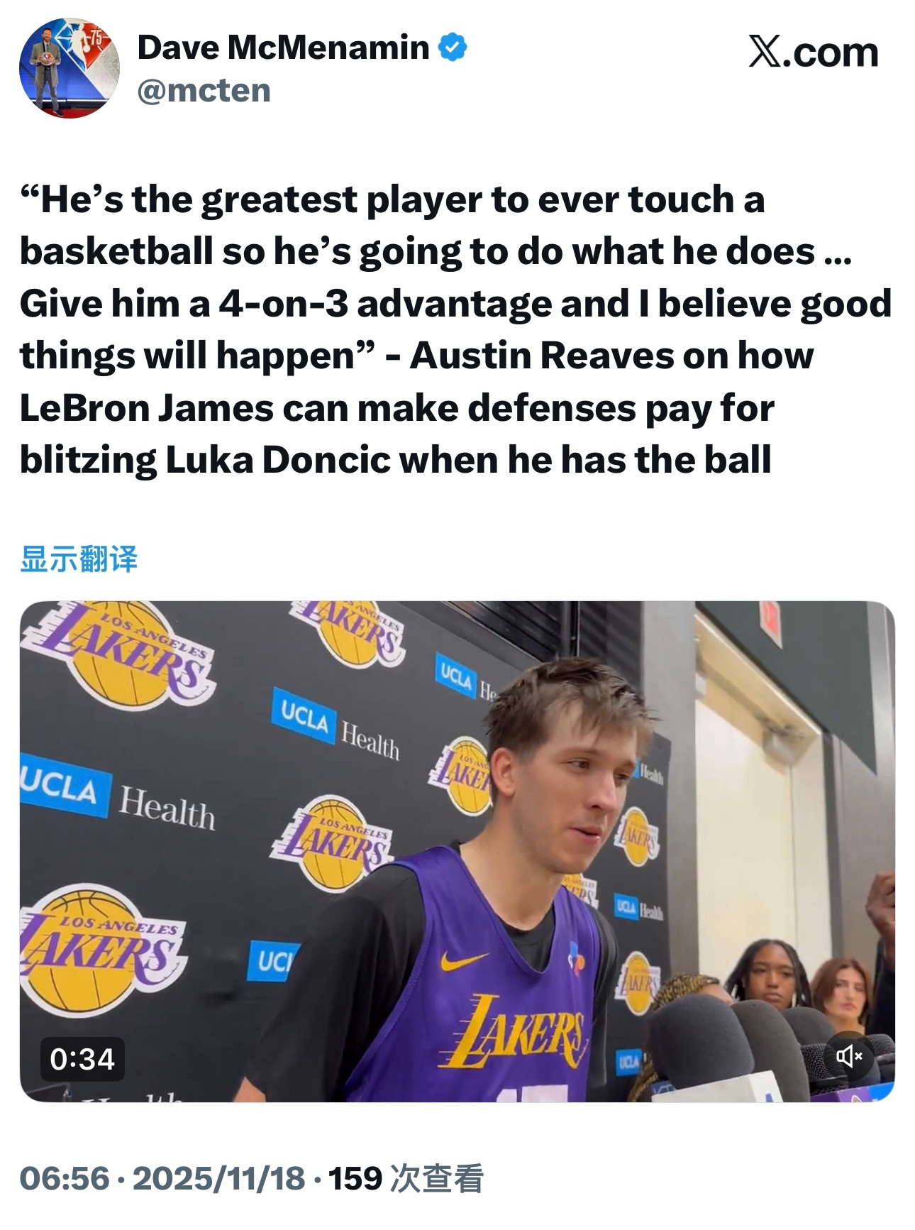 里夫斯谈詹姆斯能带来的帮助:“他是篮球历史上最伟大的球员,所以他会拿出自己的实力。要是给他创造出4打3的优势局面,我相信肯定会有好结果。当东契奇持球时,对手如果选择包夹他,勒布朗就能让对方的防守付出代价。”