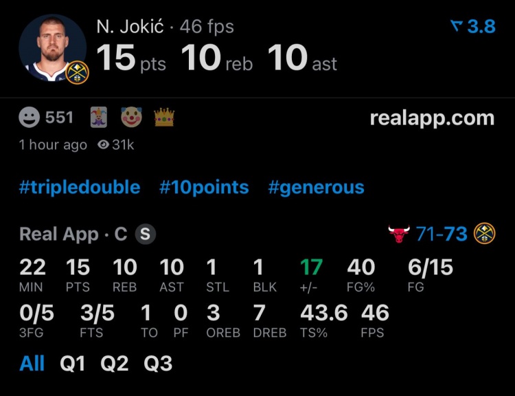 本场比赛至今,约基奇出战22分钟已经15中6拿下15分10篮板10助攻的三双数据。