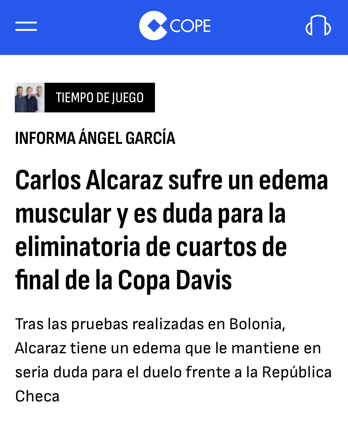 阿卡伤情的磁共振检查结果出来了,右腿肌肉出现肿胀,继续参赛有撕裂风险。不过即便如此,阿卡目前仍未宣布退出本周四开赛的戴维斯杯。他团队目前透露的安排是周二暂停训练,周三再进行一次检查,最后决定是否参赛。如果参赛的话,一天不会超过一场比赛。哎,这只铁憨憨,什么时候才能学会毫不犹豫地说个“不”啊。。。