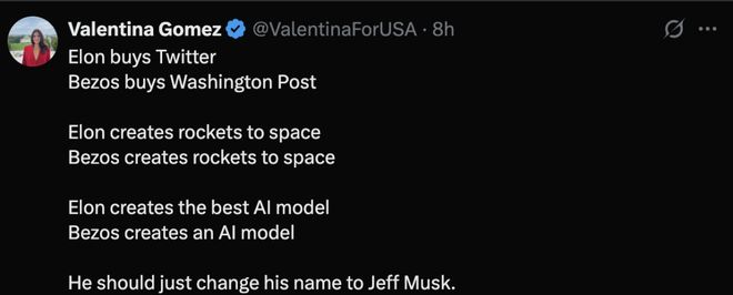 网友ValentinaGomez「建议」贝索斯应该改姓马,改名叫杰夫·马斯克: