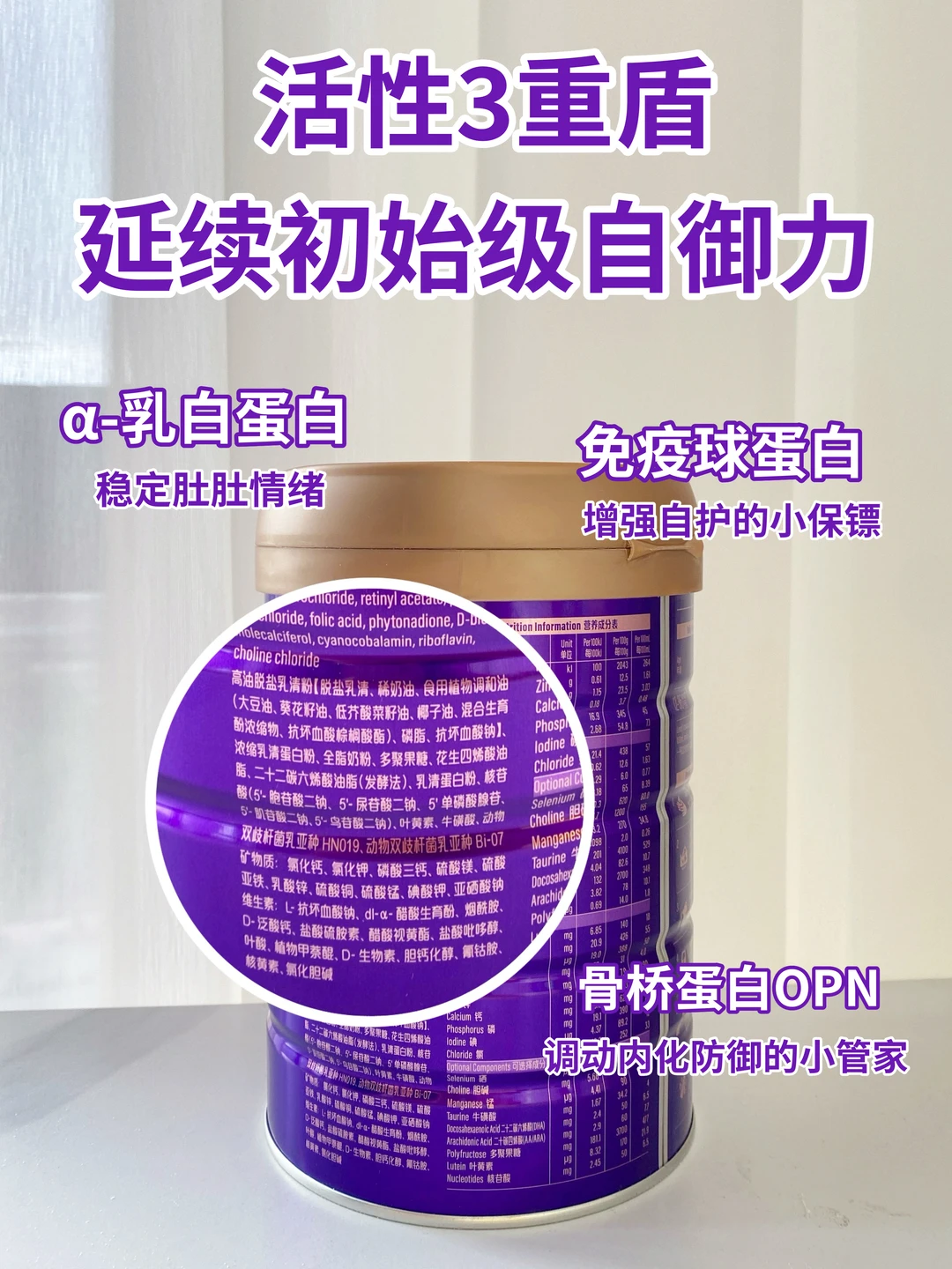 它还通过干混一次成粉工艺牢牢锁住了天然蕴含的活性营养,为宝宝打造了“活性3重盾”,延续宝宝天生自御力