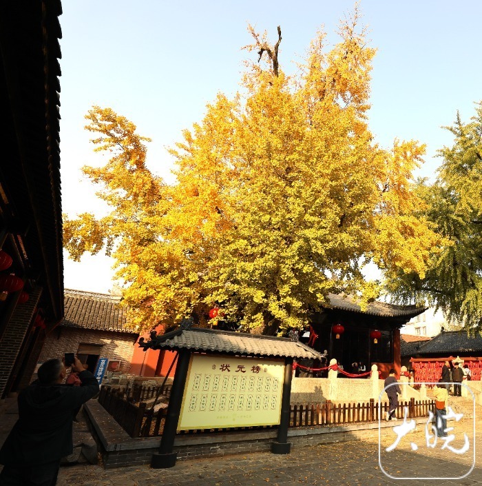 大皖新闻讯11月17日,游人在寿县古城孔庙内观赏银杏树。时下,寿县古城内11株“国宝级”银杏树树叶由绿变黄,进入最佳观赏期。