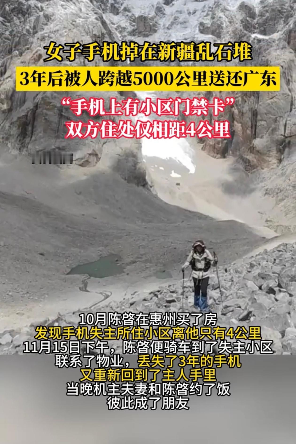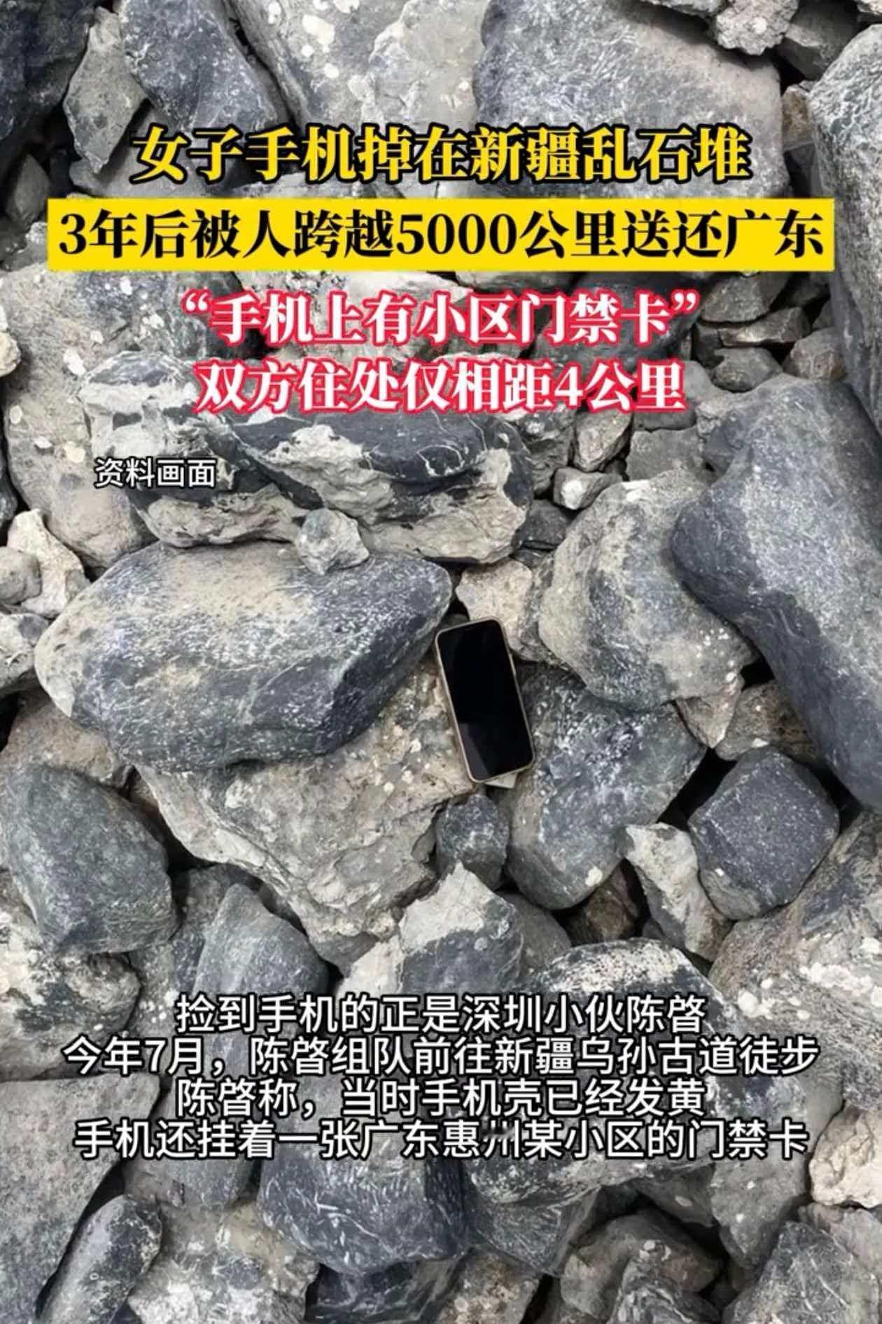 广东这边的李女士,三年前走新疆乌孙古道,乱石坡落脚没踩稳,人没事,手机直接甩出去了,往石缝里一钻影都没了,她蹲在那翻半天,石头一层套一层,越翻越乱,身上背的水也不多,天色往下压,只能先撤,回家时心里已经当作丢了这件事过去了,最近电话响起,有人说在那边捡到一部手机,信息对上就是她那部,捡到的人新家在这边,和她小区直线只隔四公里。 当时那片乱石坡脚感很滑,鞋底踩上去就飘,手机飞出那一刻她都没看清方向,等追过去只见满地碎石,石缝细到手指缝都塞不进,风一吹沙子飘起来,眼睛都进了土,头发上全是灰,她顺着坡上坡下来回折返,围着几块大石头转了好几圈都没结果,天一暗,路不熟,队友催着下撤,她把兜拍了拍,空空的。 心里那会儿也有个计算,这地儿离广东五千多公里,人回来就忙工作了,手机就换新的在用,卡停机,备份照旧,原来那一部就当留在山里。 这边有个陈先生,前几天去走乌孙古道,他过到同一片乱石坡,低头看见石缝里卡着个黑壳,边上落了一层细土,用指甲抠出来擦了擦玻璃,形状一看就是手机,边角有划痕,外壳没裂,手掌一按有重量。 他按了电源键,屏一亮,电量只剩一点点,天气干,石缝又挡风挡雨,三年靠这个环境把机器护住了,机身散了点灰,按键都还能用。 他把卡托找了找,翻到里头夹着一张门禁卡,卡面小区名字写得清楚,背面有门牌号码,他把导航打开输入,地图一缩放,自己刚买的新房就在附近,直线四公里,一条路骑车十几分钟。 这事摆在面前,他就想把这件物件还回去,人就从新疆回来后没几天在广州这边忙装修,他抽开半天,按卡上的地址过去,门口保安核对了一下,联系到业主,电梯上楼,手机递到李女士手里。 李女士接过那一刻整个人愣住,手掌里这个手感太熟,边上那道划痕她一下子认出来了,这部在她记忆里停在三年前的那个下午,她早已用上新机,原件还能回到眼前,她把卡拿出来看,门禁还能刷开,家里人围过来看了一圈。 有网友留言,丢在新疆能回广东,还刚好住得不远,这种碰上挺少见,有人说捡到的人主动送回去,换个人可能当旧物处理掉了,手机型号也老了,用处不大。 这事里头信息很清楚,一个人在山里看见卡片,地址写着,他核对定位,找到门口,物品归还,动作不复杂,步骤就这么几步,落点很实在。 出去玩的人也能做点准备,手机套上挂绳扣在背带上,走碎石路口袋别装,人弯腰容易滑落,带个防水袋塞进包的内层,拉链拉紧,机身里头留个紧急联系的信息,卡片也行,锁屏备注也行,真丢了有人能看见能找到你,时间再久也能有回路。