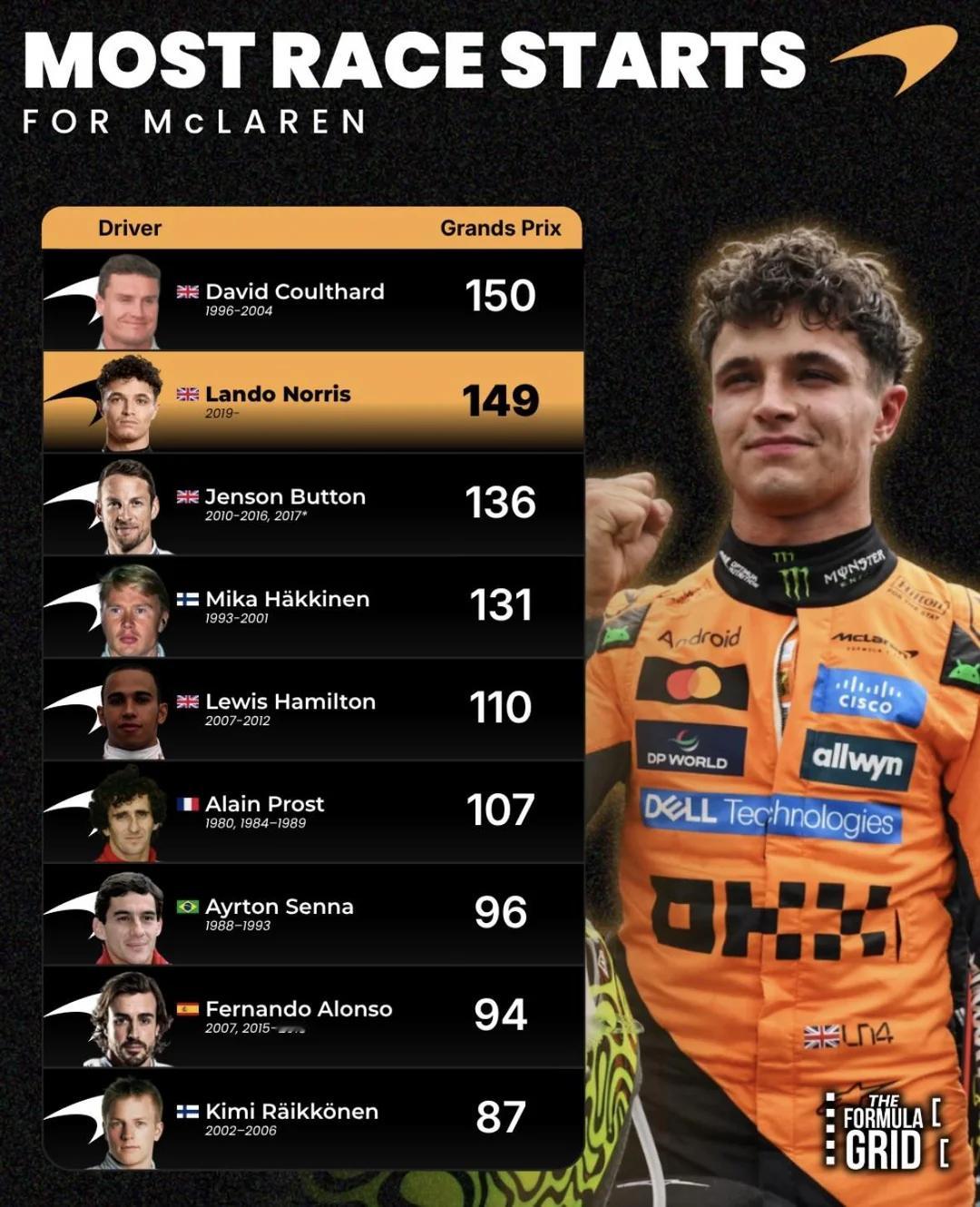 诺里斯即将在本周迎来在迈凯伦生涯的第150场大奖赛同时也将追平大卫·库特哈德,成