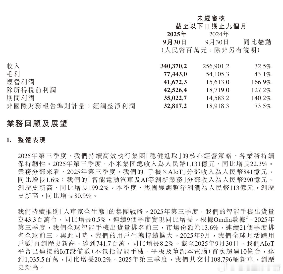 小米集团发布 2025 年第三季度财报- 总营收 1131 亿元,同比增长22.3%;智能电动汽车及 AI 等创新业务收入 290 亿元,首次实现单季盈利,经营收益 7 亿元;- 经调整净利润 113 亿元,同比增长 80.9%;- 研发费用投入 91 亿元,同比增长 52.1%;研发总人数 24871 人;- 新车交付 108796 台,小米 YU7 10 月份 SUV 销量第一;