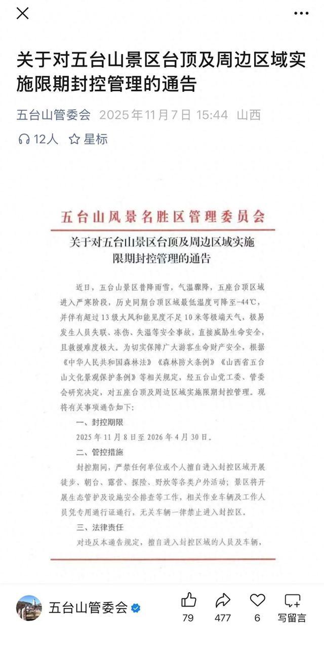 据五台山管委会公众号发布,由于近期五台山景区普遍雨雪,气温骤降,五座台顶区域进入严寒阶段,极易发生人员失联、冻伤、失温等安全事故,直接威胁生命安全,且救援难度极大,因此2025年11月8日至2026年4月30日将对五座台顶及周边区域实施限期封控管理,封控期间严禁任何单位或个人擅自进入封控区域开展徒步、朝台、露营、探险、野炊等各类户外活动,违反者景区综合行政执法队、公安分局等部门将依法予以劝返。
