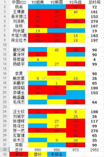 直播吧11月18日讯在本届熊猫杯赛事结束后,记者丁旭统计了中国U22球员在赛事中的出场时间,其中刘浩帆、贺一然两人打满了全部的三轮比赛。