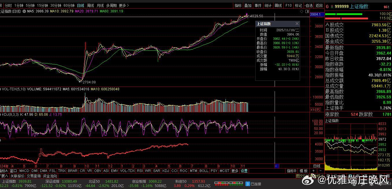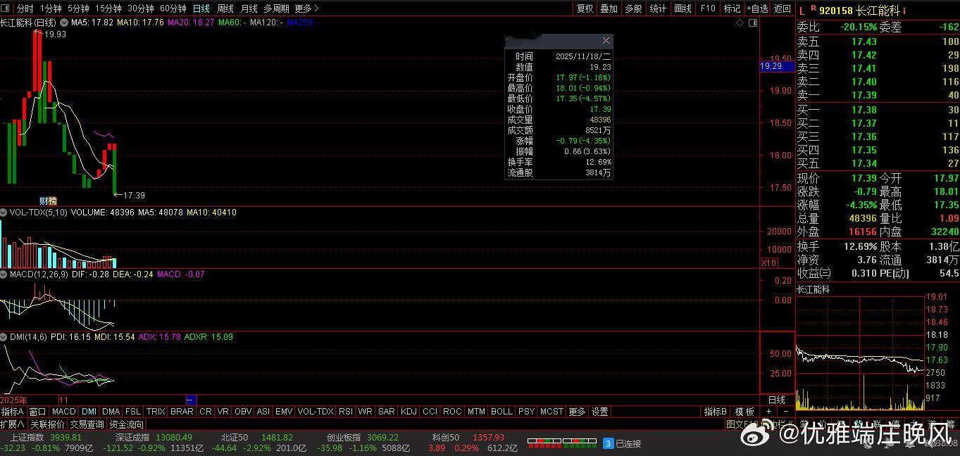 【财富晚茶】今日股市收评:深指跌0.92%:游戏震荡回升兵装杀跌导语:作者系《网易号》优质财经领域创作者。曾经原创作者和知名网易号旅游领域创作者。大跨度行业等的写作,颇受网友喜爱。作品发表于2025.11.18.15:18优雅端庄晚风。一、视野焦点:恰似“火眼金睛”920158 长江能科 盘中 -01涨1、突破一年箱底视野盘面:历史最低:反弹在即:2025-11-18 截至1500:股价报收:17.39元。股指上涨-4.35%。成交总量:48396手,成交金额:8521元。总换手率12.69%,观总市值:24.01亿元。流通市值:6.63亿元。2、能化设备翘楚品牌经营:能源化工专用设备研产和销售。公司品牌:电脱设备市场占有率居国内第一。3、营收净利尚可业绩好转:2025-09-30 半年度报:公司营收:2.0866亿 同比增5.15%。公司净利:3304.1149万 同比增3.75%。二、空方强势:恰似“弱肉强食”1、博弈追踪盘面第一、沪深盘面透析沪深回放:跌宕起伏。早盘:低开二跌,三涨二跌。午盘:三跌一涨,三跌二涨。尾盘:见底抢筹,次低绿盘。第二、透析沪深指数追寻沪深:跌宕起伏。沪指跌0.81%(032.23点),报03939.81点,成交额07909亿。深指跌0.92%(121.52点),报13080.49点,成交额11351点。创指跌1.16%(035.98点),报03069.22点,成交额05088亿。北指跌2.92%(044.64点),报01481.82点,成交额00201亿。沪深北市:合计成交:19461亿元。2、复盘沪深个股第一、今日个股视野今日观察:涨跌互动。1278上涨,57个股涨停板。4106股下跌,57跌停板。沪深北市:合计成交19461亿元。三、沪深阴棒:恰似“满天阴霾”1、洞察机构尾盘主旋律:沪深弱势,尾盘躺底。沪指距9:31-15:00:前1小时放量盘跌,中2小时略量盘跌,后1小时略量盘跌。深指距9:31-15:00:前1小时放量盘升,中2小时略量盘跌,后1小时略量盘跌。沪深两市:合计成交:19461亿元。四、资金流向:恰似“水落石出”1、目击主力资金Wind统计显示:主力资金今日净流出633.91亿元,其中,创业板主力资金净流出217.99亿元;沪深300成份股主力资金净流出151.35亿元;科创板主力资金净流出3.77亿元。申万所属的31个一级行业,今日有4个行业主力资金呈现净流入,其中,传媒行业主力资金净流入最多,净流入金额为25.33亿元;行业主力资金净流入居前:计算机、通信、美容护理等。27个行业主力资金呈现净流出,其中,电力设备行业主力资金净流出最多,净流出金额为205.28亿元;行业主力资金净流出靠前:有色金属、化工、医药生物、电子、汽车、国防军工等。2、龙虎榜晴雨表收盘龙虎榜数据:机构席位资金合计:净卖出约14.25亿元。其中,净买入的个股12只,净卖出的个股21只。机构净买入最多:德力佳,净买入金额约1.25亿元;机构净买入居前:大为股份、永太科技、亚翔集成等股。机构净卖出最多:天赐材料,净卖出金额约3.82亿元;机构净卖出居前:华盛锂电、多氟多、值得买、天际股份、龙迅股份等股。3、涨停板跌停板第一、板块涨停上涨板块:广告营销、电子商务、送转超跌、Sora概念、数字媒体等。下跌板块:焦炭加工、活跃股、融资增加、钠电池、地面兵装等。第二、个股涨跌沪深个股:跌多涨少,空方强势,略胜一筹。其中,1278上涨,57个股涨停板。4106股下跌,57跌停板。沪深北市:合计成交19461亿元。4、明天趋势先知第一、沪指预测11月19日:沪指突破阻力:03966点看涨,前程似锦;跌破支撑位:03926点看跌,日暮途穷。第二、深指预测11月19日:深指突破阻力:13223点看涨,鹏程万里;跌破支撑位:13022点看跌,不堪造就。五、本创作者:恰似“优质网易”投资投机迷茫之中:给予尽可能有帮助:资本市场风险自负。(优雅端庄晚风《网易号》优质财经领域创作者和原创作者; 违者必究)