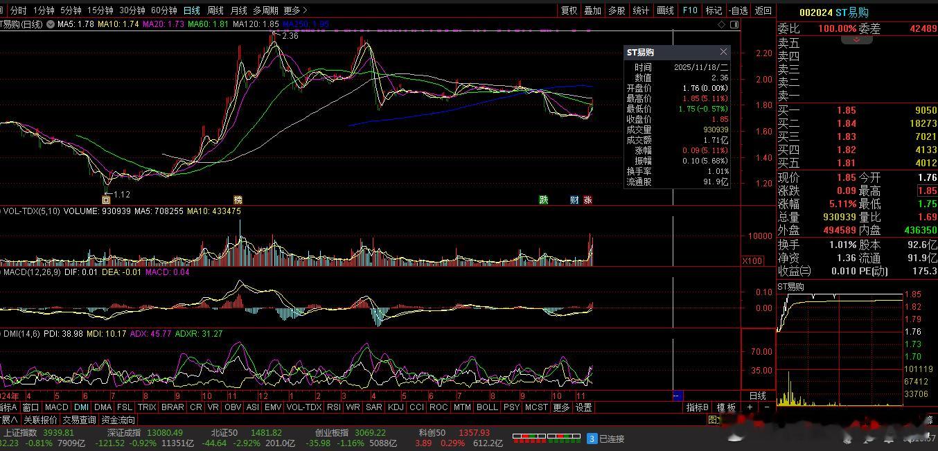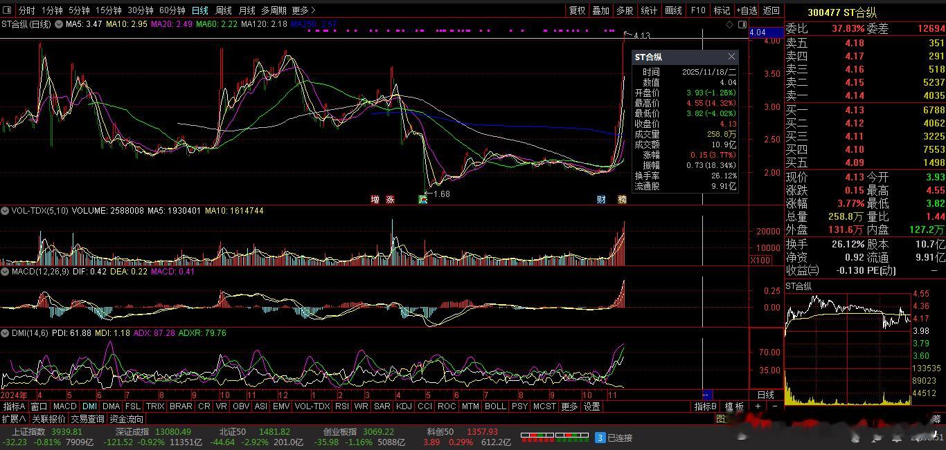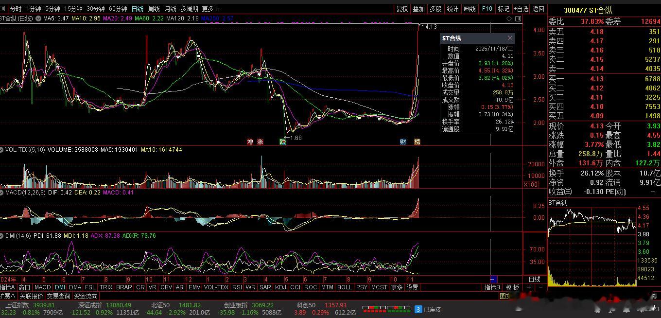 【财富晚茶】三元股市收评:沪指跌0.81%:厨卫强势上扬电池探底导语:作者系《网易号》优质财经领域创作者。曾经原创作者和知名网易号旅游领域创作者。大跨度行业等的写作,颇受网友喜爱。作品发表于2025.11.18.15:18优雅端庄晚风。(标题照片:全球最佳厨卫电器:超高端市场奢侈品牌:德国的Miele)一、ST合纵:三年筑底300477 ST合纵 盘中 05涨1、三年底部:等待突破视野盘面:前期三底:增量脉冲。2025-11-18 截至15:00:股价报收:4.13元。该股上涨3.77%。成交总量:258.80万手,成交金额:10.90亿元。总换手率26.12%,观总市值:40.92元。流通市值:40.92亿元。2、一流配电:头部企业主营业务:配电变电控制设备-锂电池正极前驱体研造和销售。公司品牌:一流配电智慧能源领域系统解决方案服务商和先进锂电池材料前驱体供应商。3、营收减少:净利减亏财报透视:2025-09-30 一季度报:公司营收:11.0907亿 同比增-48.72%,实现净利润-1.352亿 同比增25.13%。二、多空搏杀:沪深绿盘1、追踪盘面:蛛丝马迹。沪深场景:早盘:低开二跌,三涨二跌。午盘:三跌一涨,三跌二涨。尾盘:见底抢筹,次低绿盘。看点之一:沪深股指:盘中低开:震荡下探。午后利空:加速下行。看点之二:一枝独秀:科创50指:最高涨1.48%。看点之三:沪深北市:合计成交:19461亿元。场内个股:4106股飘绿。2、板块涨跌:风口依然涨跌观察:板块见证。板块拉升:厨卫、半导体等。板块走低:电池、煤炭、钢铁、有色、化工、地产、电力、石油等。概念活跃:AI应用、存储芯片、网游等。3、技术看盘:涨跌位置观K线提示:精彩多空博弈。沪深两指预测:11月19日:沪指突破阻力:03966点看涨,前程似锦;跌破支撑位:03926点看跌,日暮途穷。深指突破阻力:13223点看涨,鹏程万里;跌破支撑位:13022点看跌,不堪造就。三、三元板块:风口潜水1、追踪盘面:视角视野三元弱势回调,沪深杀跌躺平。10股上涨,涨幅5%以上:5股涨停板。111股下跌,跌幅5%以上:17股跌停板。涨幅0%:1股0停板。涨幅0.00%+上涨个股:1+10=11股票赚钱。沪深两市:合计成交19461亿元。总体归纳:三元股票:盘口弱势。2、追踪盘面:主力进退换位思考:沪深杀跌,尾盘抢筹。沪指距9:31-15:00:前1小时放量盘跌,中2小时略量盘跌,后1小时略量盘跌。深指距9:31-15:00:前1小时放量盘升,中2小时略量盘跌,后1小时略量盘跌。沪深两市:合计成交:19461亿元。四、透析个股:聚焦涨跌1、涨幅榜眼:处排查摸主旋律:涨幅榜之中:寻找启动600340 华夏幸福 002024 ST易购 300477 ST合纵涨幅榜-1:600340 华夏幸福主营业务:产业新城-商业地产。公司品牌:中国产业新城服务商。涨幅榜-2:002024 ST易购主营业务:出版物省内连锁-包装食品-国内快递-家用电器-计算机软件开发-实业投资等。公司品牌:全国性家用电器连锁零售头部企业。涨幅榜-3:300477 ST合纵主营业务:配电变电控制设备-锂电池正极前驱体研造和销售。公司品牌:一流配电智慧能源领域系统解决方案服务商和先进锂电池材料前驱体供应商。2、跌幅榜眼:处排查摸主旋律:跌幅榜之中:寻找金子600370 三房巷 600162 香江控股 002496 *ST辉丰跌幅榜-1:600370 三房巷主营业务:瓶级聚酯切片-PTA-PBT工程塑料-热电等的研产和销售。公司品牌:功能性 r-PET 瓶片头部企业。跌幅榜-2:600162 香江控股主营业务:商贸流通运营-城市发展配套建设业务。公司品牌:行业领先高品质产业生活平台头部企业。跌幅榜-3:002496 *ST辉丰主营业务:生物农资-农资电商-石化仓储供应链-项目投资。公司品牌:中国领先亚临界小分子高温裂解工艺高科技专利产品和头部企业。3、潜力榜眼:处排查摸主旋律:潜力榜之中:寻找估值002496 *ST辉丰 300301 *ST长方 000669 ST金鸿潜力榜-1:002496 *ST辉丰主营业务:生物农资-农资电商-石化仓储供应链-项目投资。公司品牌:中国领先亚临界小分子高温裂解工艺高科技专利产品和头部企业。潜力榜-2:300301 *ST长方主营业务:LED照明光源器件。公司品牌:LED照明光源器件头部企业。潜力榜-3:000669 ST金鸿主营业务:天然气。公司品牌:国内最具实力的综合性清洁能源服务商。五、本创作者:优质网易投资投机迷茫之中:给予尽可能有帮助:资本市场风险自负。(优雅端庄晚风《网易号》优质财经领域创作者和原创作者; 违者必究)