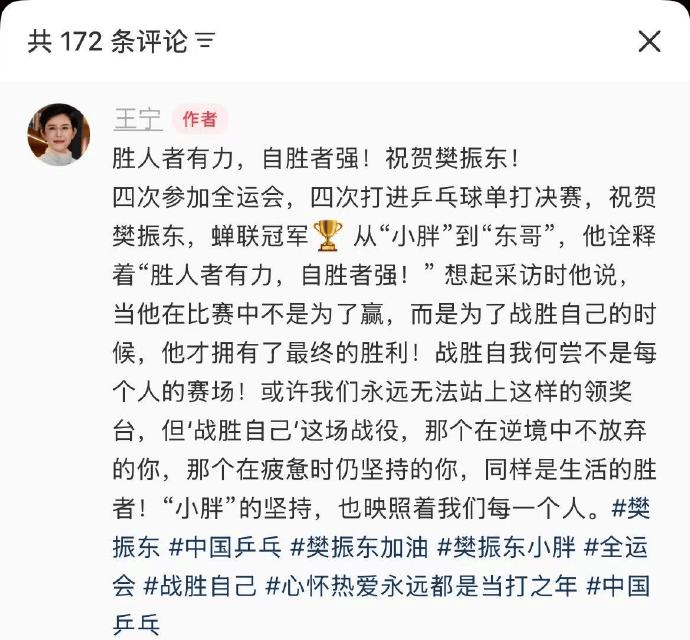 王宁在社媒上写道:“胜人者有力,自胜者强!祝贺樊振东!四次参加全运会,四次打进乒乓球单打决赛,祝贺樊振东,蝉联冠军!“