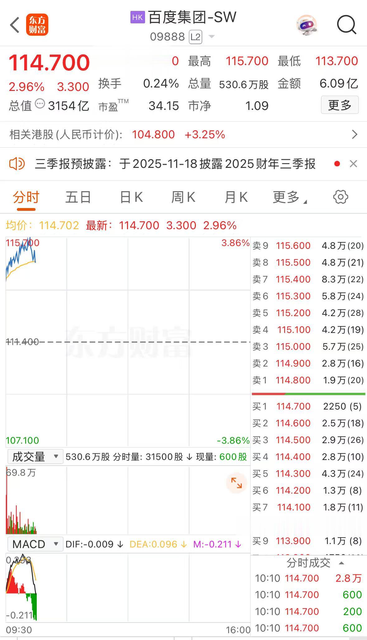 上证报中国证券网讯(记者刘逸鹏)11月19日,百度集团-SW高开2.24%,报113.9港元/股。截至10时10分,该股涨近3%,报114.7港元/股。