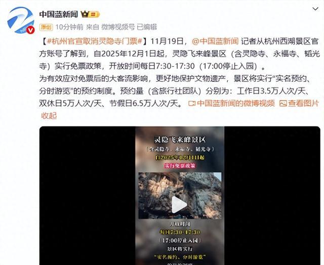 11月19日,@中国蓝新闻记者从杭州西湖景区官方账号了解到,自2025年12月1日起,灵隐飞来峰景区(含灵隐寺、永福寺、韬光寺)实行免票政策,开放时间每日7:30-17:30(17:00停止入园)。