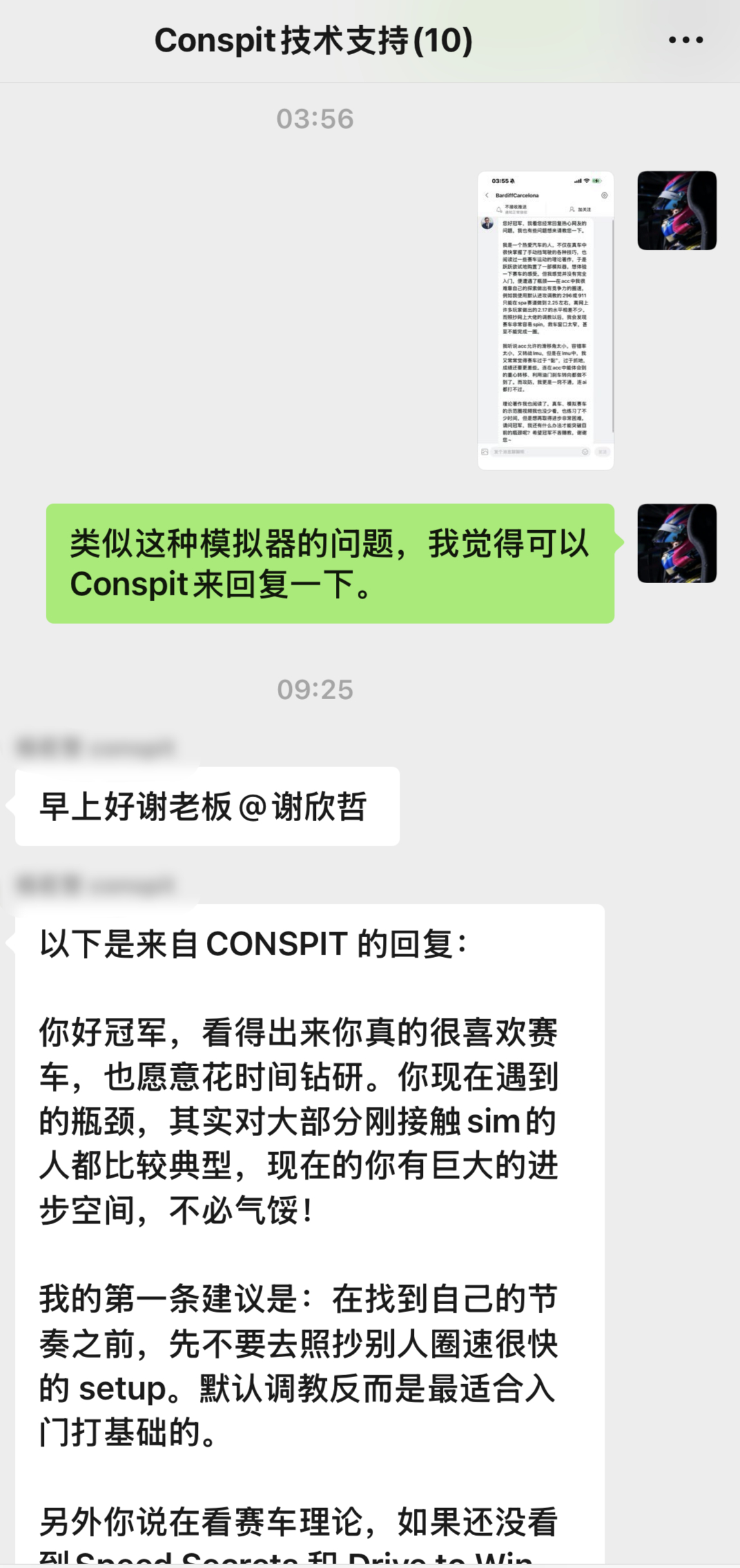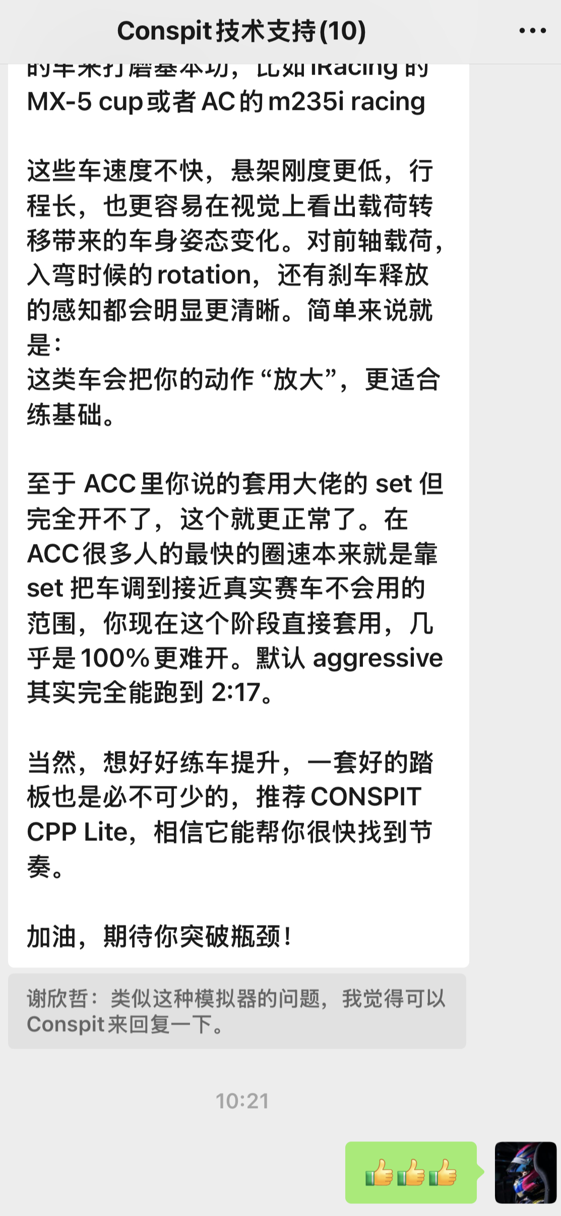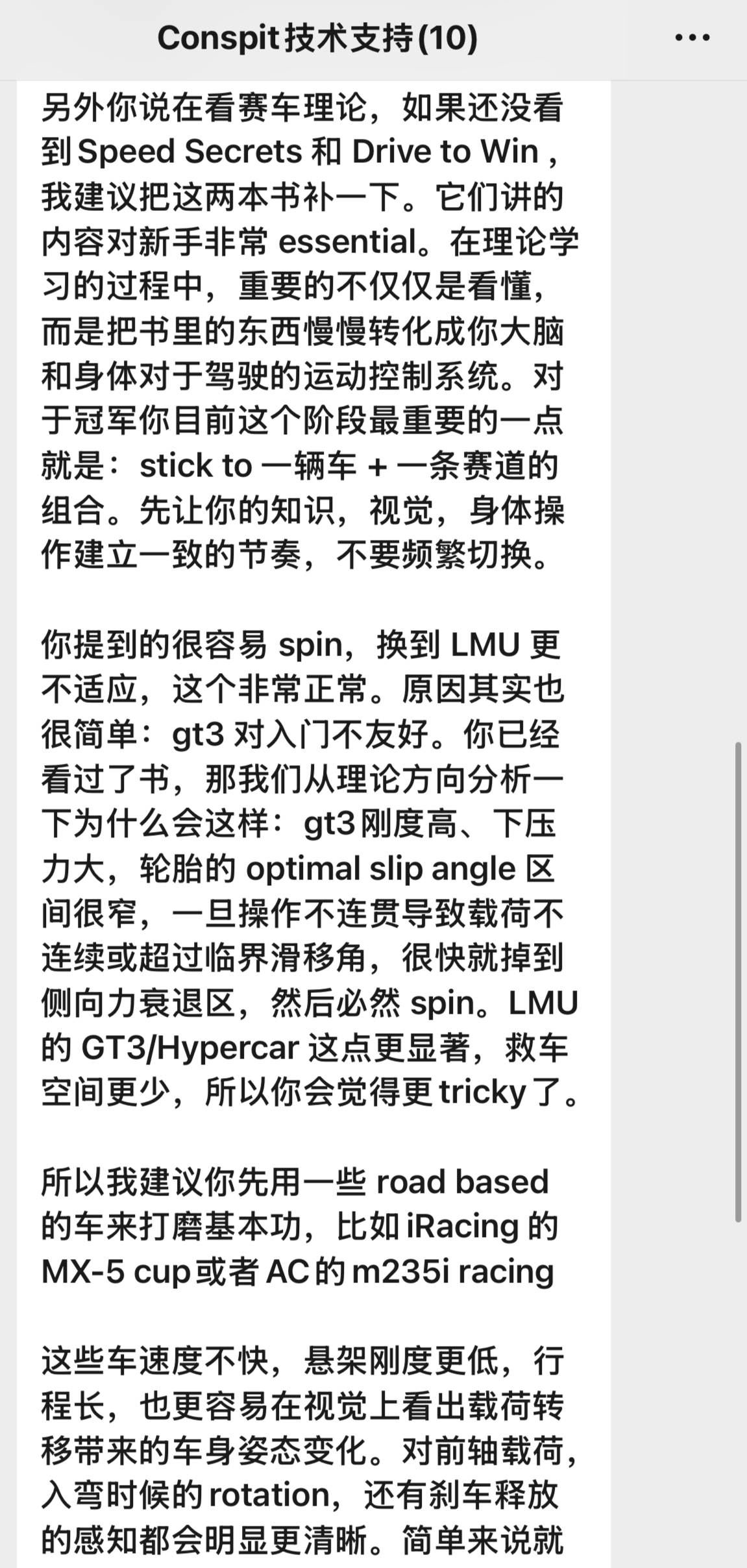 模拟器圈速如何突破 我请专业团队来回答了一下以下是来自CONSPIT 的回复:你好冠军,看得出来你真的很喜欢赛车,也愿意花时间钻研。你现在遇到的瓶颈,其实对大部分刚接触sim的人都比较典型,现在的你有巨大的进步空间,不必气馁!我的第一条建议是:在找到自己的节奏之前,先不要去照抄别人圈速很快的 setup。默认调教反而是最适合入门打基础的。另外你说在看赛车理论,如果还没看到Speed Secrets 和 Drive to Win ,我建议把这两本书补一下。它们讲的内容对新手非常 essential。在理论学习的过程中,重要的不仅仅是看懂,而是把书里的东西慢慢转化成你大脑和身体对于驾驶的运动控制系统。对于冠军你目前这个阶段最重要的一点就是:stick to 一辆车 + 一条赛道的组合。先让你的知识,视觉,身体操作建立一致的节奏,不要频繁切换。你提到的很容易 spin,换到 LMU 更不适应,这个非常正常。原因其实也很简单:gt3 对入门不友好。你已经看过了书,那我们从理论方向分析一下为什么会这样:gt3刚度高、下压力大,轮胎的 optimal slip angle 区间很窄,一旦操作不连贯导致载荷不连续或超过临界滑移角,很快就掉到侧向力衰退区,然后必然 spin。LMU 的 GT3/Hypercar 这点更显著,救车空间更少,所以你会觉得更tricky了。所以我建议你先用一些 road based 的车来打磨基本功,比如iRacing 的MX-5 cup或者AC的m235i racing这些车速度不快,悬架刚度更低,行程长,也更容易在视觉上看出载荷转移带来的车身姿态变化。对前轴载荷,入弯时候的rotation,还有刹车释放的感知都会明显更清晰。简单来说就是:这类车会把你的动作“放大”,更适合练基础。至于 ACC里你说的套用大佬的 set 但完全开不了,这个就更正常了。在ACC很多人的最快的圈速本来就是靠 set 把车调到接近真实赛车不会用的范围,你现在这个阶段直接套用,几乎是100%更难开。默认 aggressive 其实完全能跑到 2:17。当然,想好好练车提升,一套好的踏板也是必不可少的,推荐CONSPIT CPP Lite,相信它能帮你很快找到节奏。加油,期待你突破瓶颈!