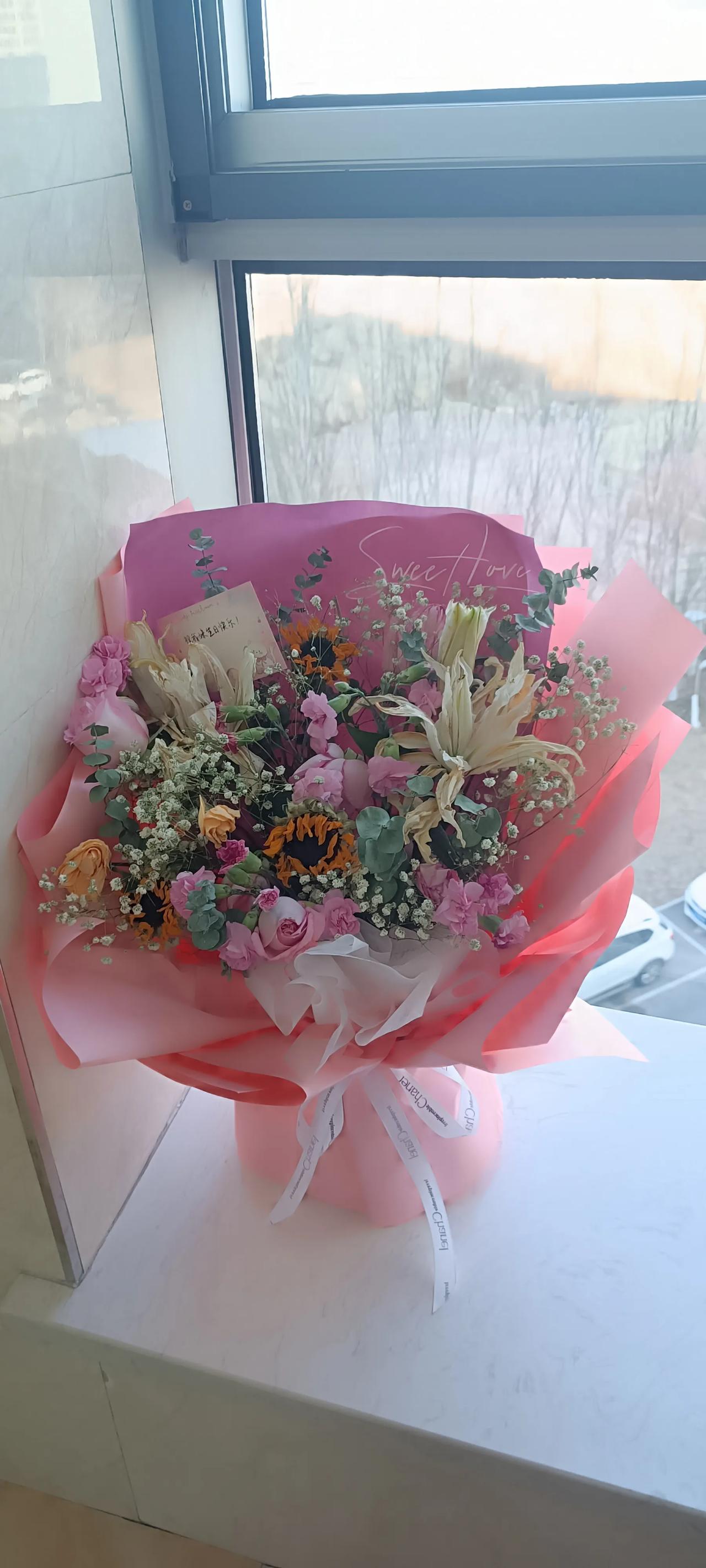 今早一进卫生间,见窗台上放着一大捧鲜花。哈哈,这是要在遗臭万年的地方流芳千古吗?