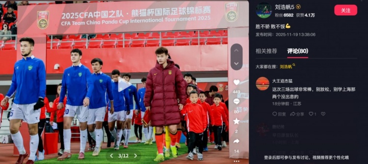 2025年熊猫杯落下帷幕,U22国足1胜1平1负获得亚军,作为球队队长,刘浩帆三场比赛全部首发且打满270分钟。今天,刘浩帆发文总结熊猫杯,他写道:胜不骄败不馁。