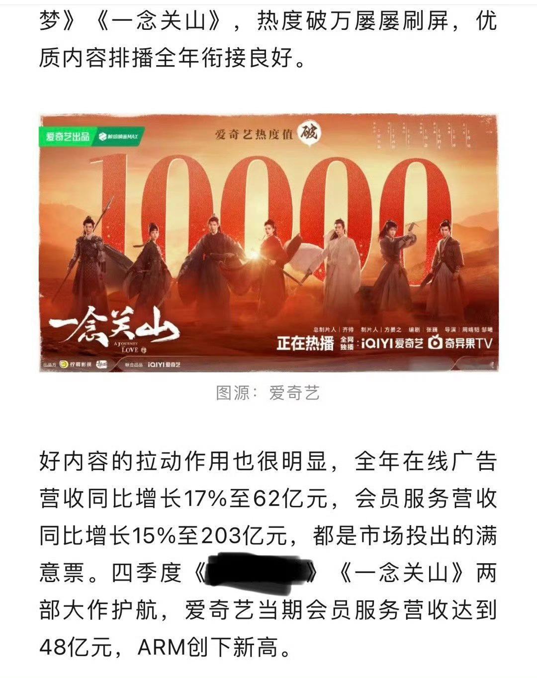 刘诗诗《一念关山》连续两年登爱奇艺财报(会员收入创纪录)刘诗诗《淮水竹亭》连续两