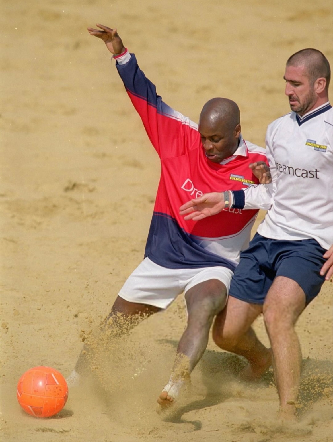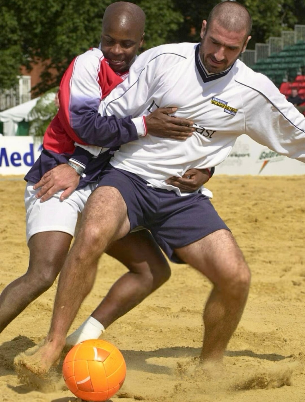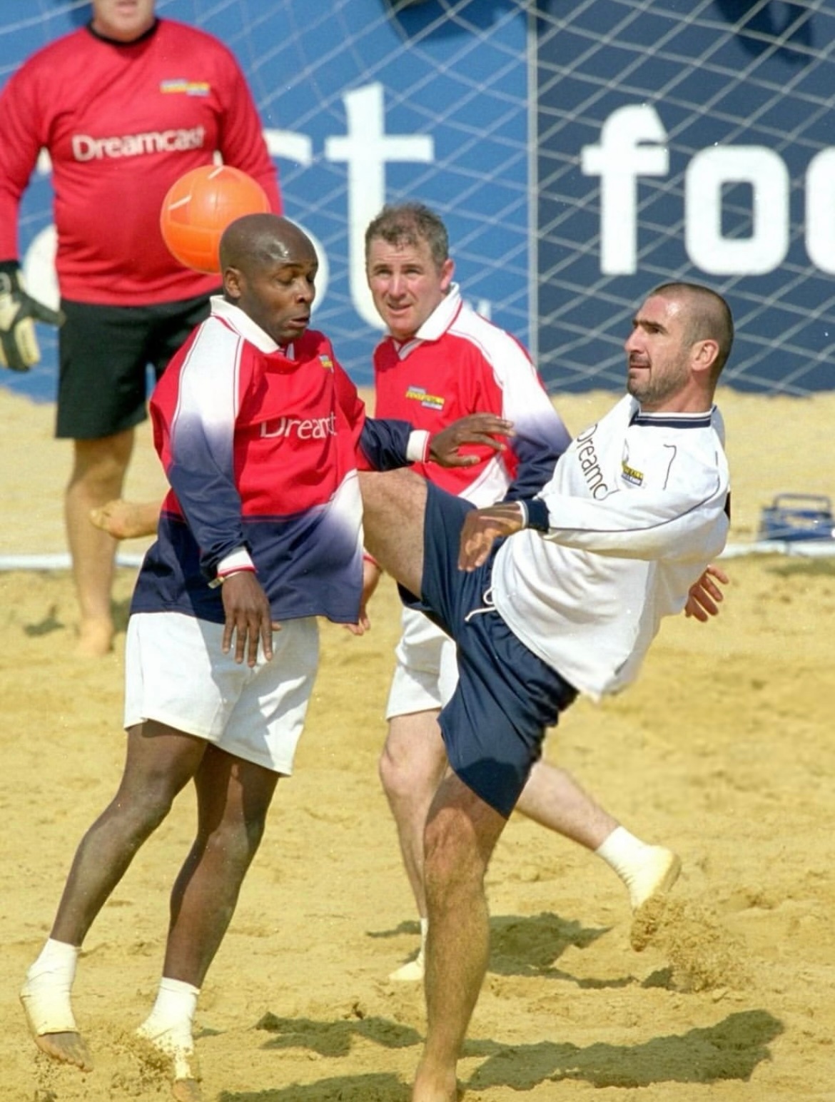 2000年7月,在伦敦踢沙滩足球的坎通纳。图中另外两位也是曾经效力曼联的球员。