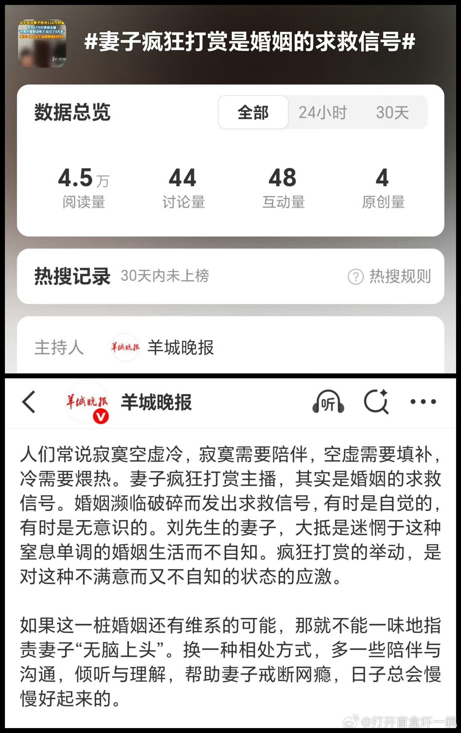 《羊城晚报》这则新闻评论的切入角度是真的挺清奇啊!丈夫辛辛苦苦打工攒够百万积蓄交给妻子保管,结果妻子竟直接挥霍一空,光是打赏主播就花了大几十万,最后愣是还能倒欠数万元网贷。媒体小编直接整了个“妻子疯狂打赏是婚姻的求救信号”的话题词,强调女方全职宝妈生活单调只能上网寻觅归属,规劝丈夫多些陪伴耐心沟通认知聆听努力理解。合着这帮记者是要求男方一边出门搬砖尽早攒够积蓄,一边围妻子转提供情绪价值是吧?普通家庭不分男女能花大几十万去打赏主播,这难道不是婚姻破裂的信号吗,谈何求救?正常人谁会用败光家产的方式来挽救婚姻?堂堂媒体社会评论竟巨婴至此,要我说新闻行业被吊销记者证的还是太少了!