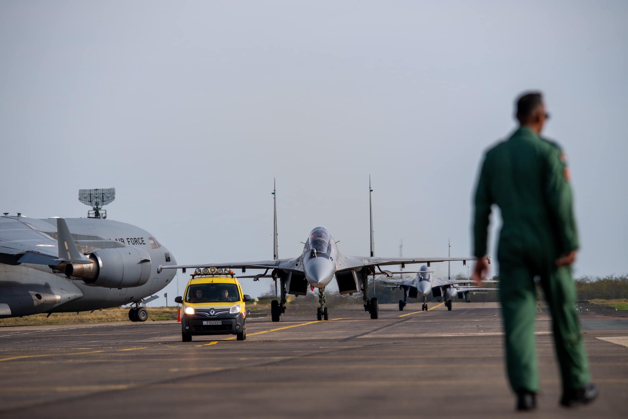 11月16日至27日,印度空军与法国空天军在法国蒙德马桑举行名为“Garuda 2025”的第八届双边联合空中演习。演习期间,Su-30MKI与法军的“阵风”将战斗机在复杂模拟空战环境中协同作战,重点演练空中格斗、防空作战及联合打击任务。“此次演习旨在通过逼真的作战环境锤炼战术战法,促进印法两国空军相互学习,提升协同作战能力。”