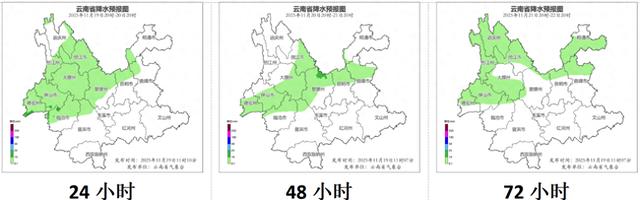 11月19日20时到11月20日20时:迪庆州东部、丽江市、怒江州南部、大理州、保山市、德宏州、临沧市北部、普洱市北部、楚雄州、昆明市北部多云间阴有阵雨局部中雨,其他地区多云间晴。