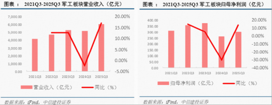 基本面上,国防军工板块业绩拐点已现。据中信建投跟踪分析,2025年三季报,板块共实现营业收入6003.75亿元,同比回升16.99%;归母净利润Q1业绩筑底,Q2景气度逐步改善,三季报共实现298.22亿元,同比回升14.01%。板块核心标的在第三季度迎来业绩拐点,营收与归母净利润实现双双同比大幅回正,底部复苏有望持续。
