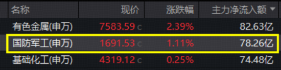 地缘因素持续发酵,资金重返国防军工!今日(11月19日)国防军工行业涨幅、主力净流入额均跻身全行业前三。